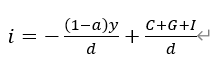3. 斜率:斜率为负。与d和a有关,但一般认为a--收入对消费的影响不会变动,所以受到d的影响:投资对利率的敏感性d越大,投资对利率越敏感,越平坦(利率变动一点点,投资增加很多);d越小,投资对利率越不敏感,越陡峭(利率需下降很多,投资才会增加);d=0,投资对利率完全不敏感,IS垂直,意味着投资陷阱(一般发生在经济衰退,企业家信心不足的时候,此时需要财政政策的干预)