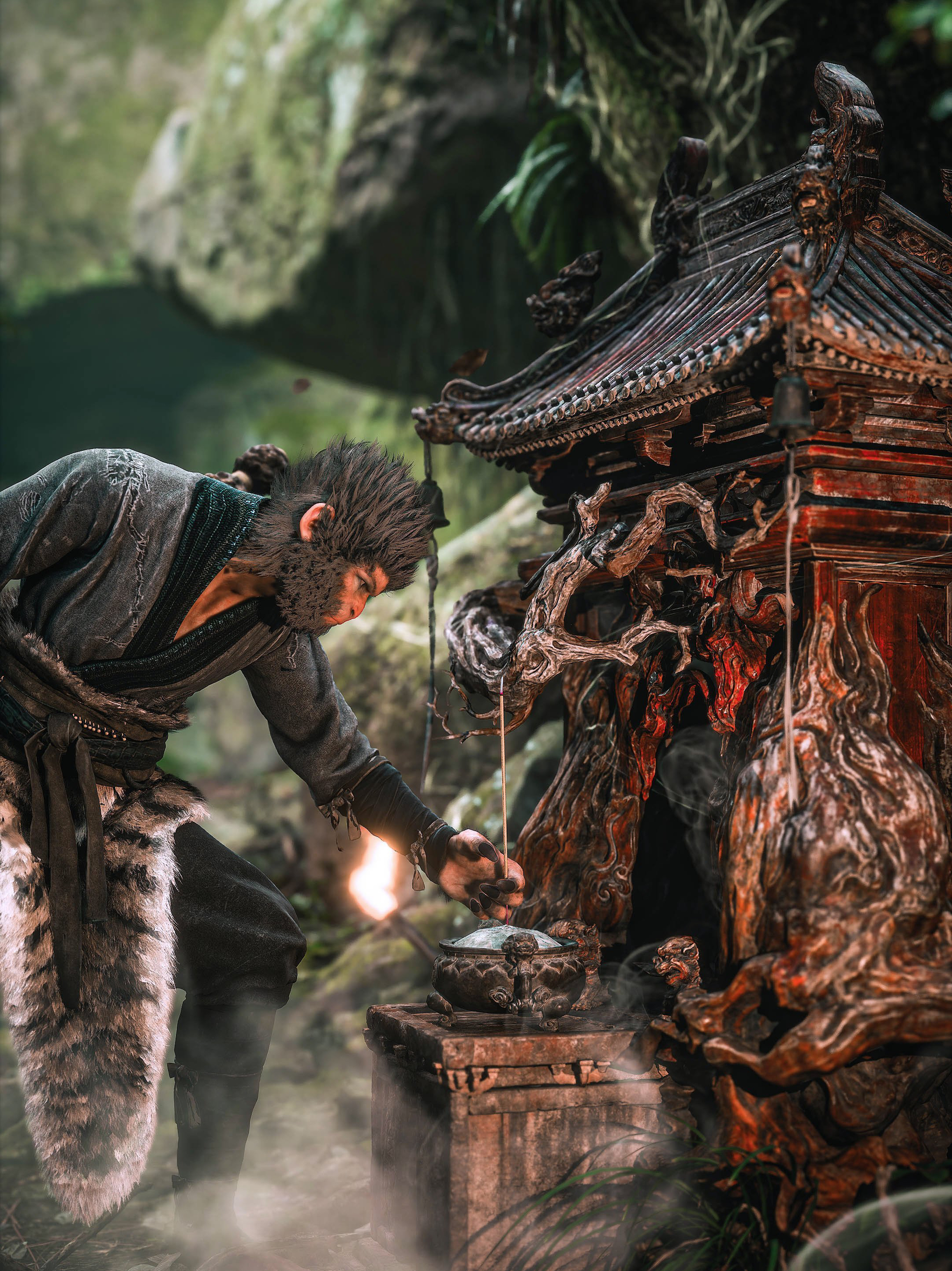 在《黑神话:悟空》这款游戏中,打坐与烧香被赋予了新的生命。它们不仅是玩家角色恢复生命、法力的机制,更是对《西游记》原著佛学和道家思想内涵的现代诠释。天命人在打坐中体验到的,不仅是能力的提升,更是心灵深处的一次洗礼;每一次烧香,不仅是角色的迅速回血,更是让取经路上的虔敬心的更加的坚定,就好像那些去西藏的朝圣者,手握转经轮,一步一叩首,眼明心净,步步生莲。