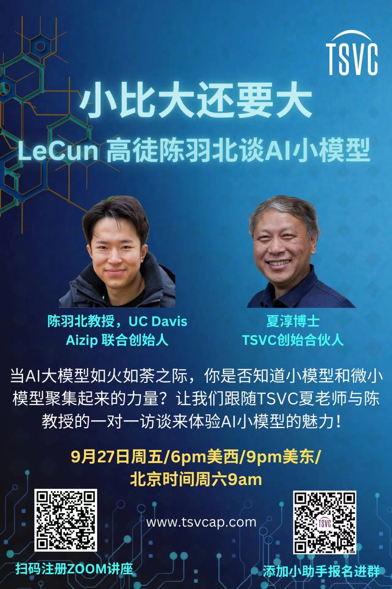 9月28日TSVC举办了《打造下一个独角兽》讲座第33讲。当AI大模型如火如荼之时,你是否知道,AI小模型和微小模型聚集起来,要远大于大模型。小模型和微小模型使得AI无所不在,哪怕是没有网络的地方。同时,AI小模型以极低的成本和最小的能耗,触达物理世界的各个角落。让我们跟随TSVC创始合伙人夏老师与“CNN之父”LeCun的高徒陈羽北教授的一对一对话来体验AI小模型的魅力!
