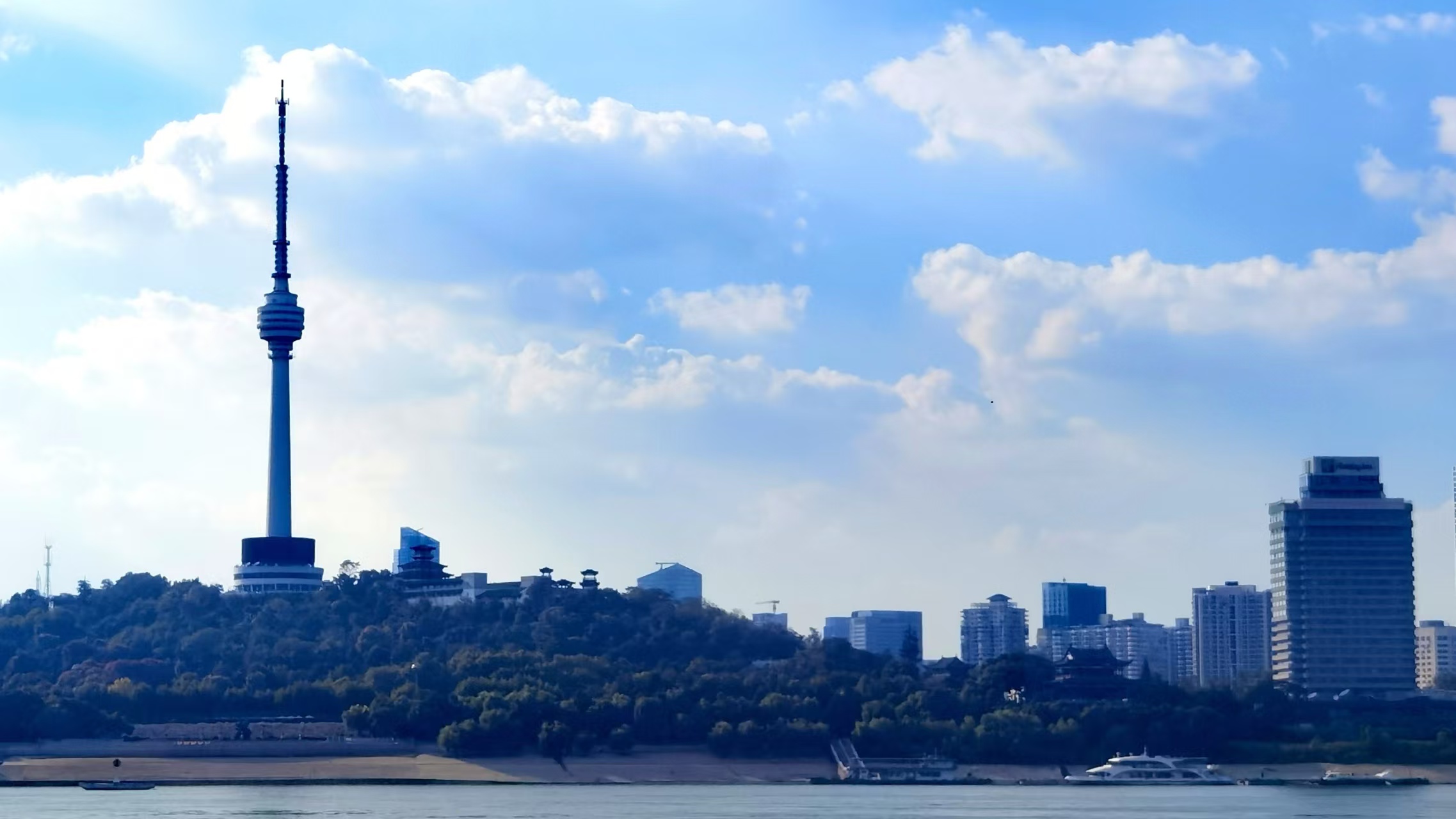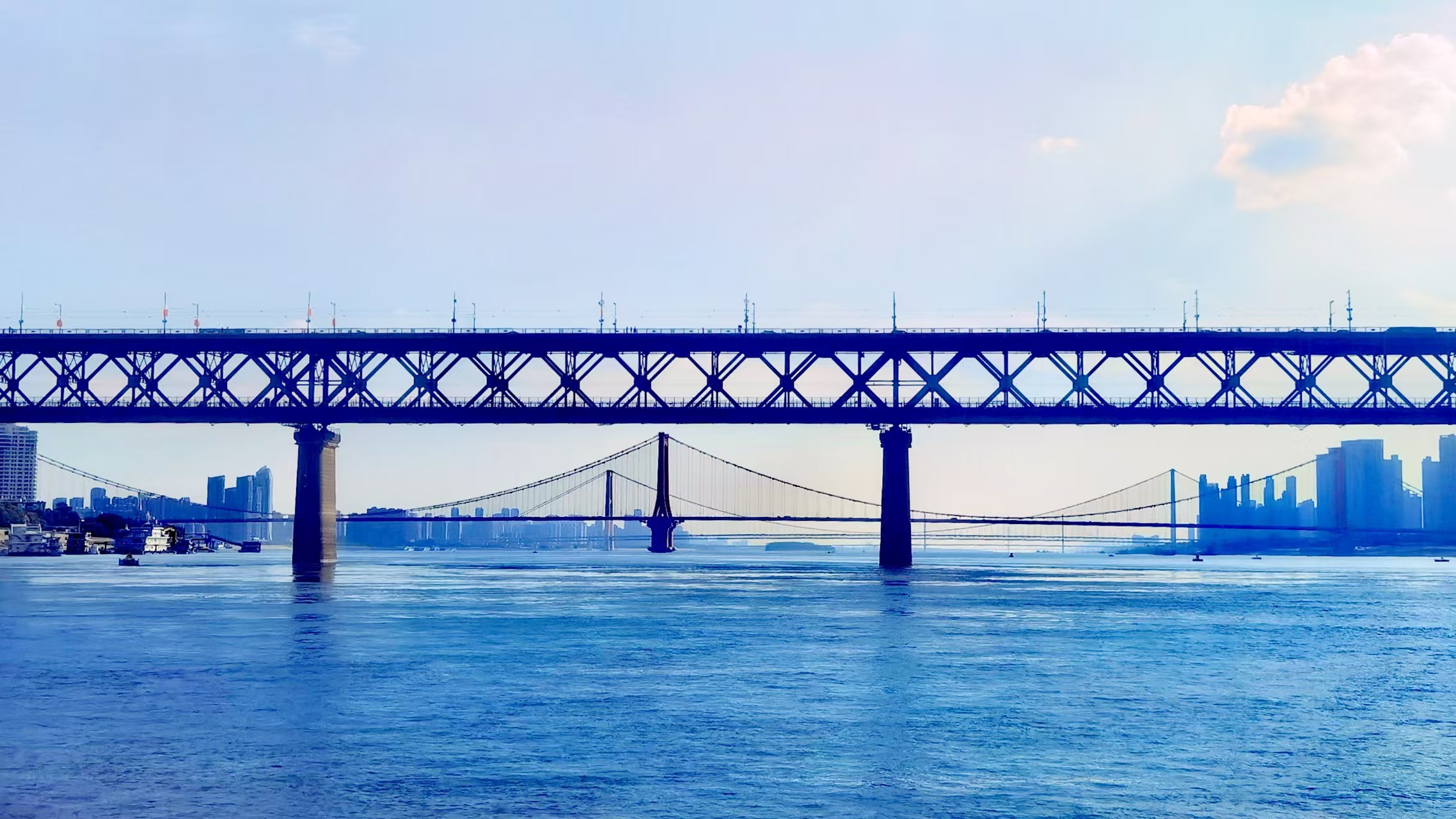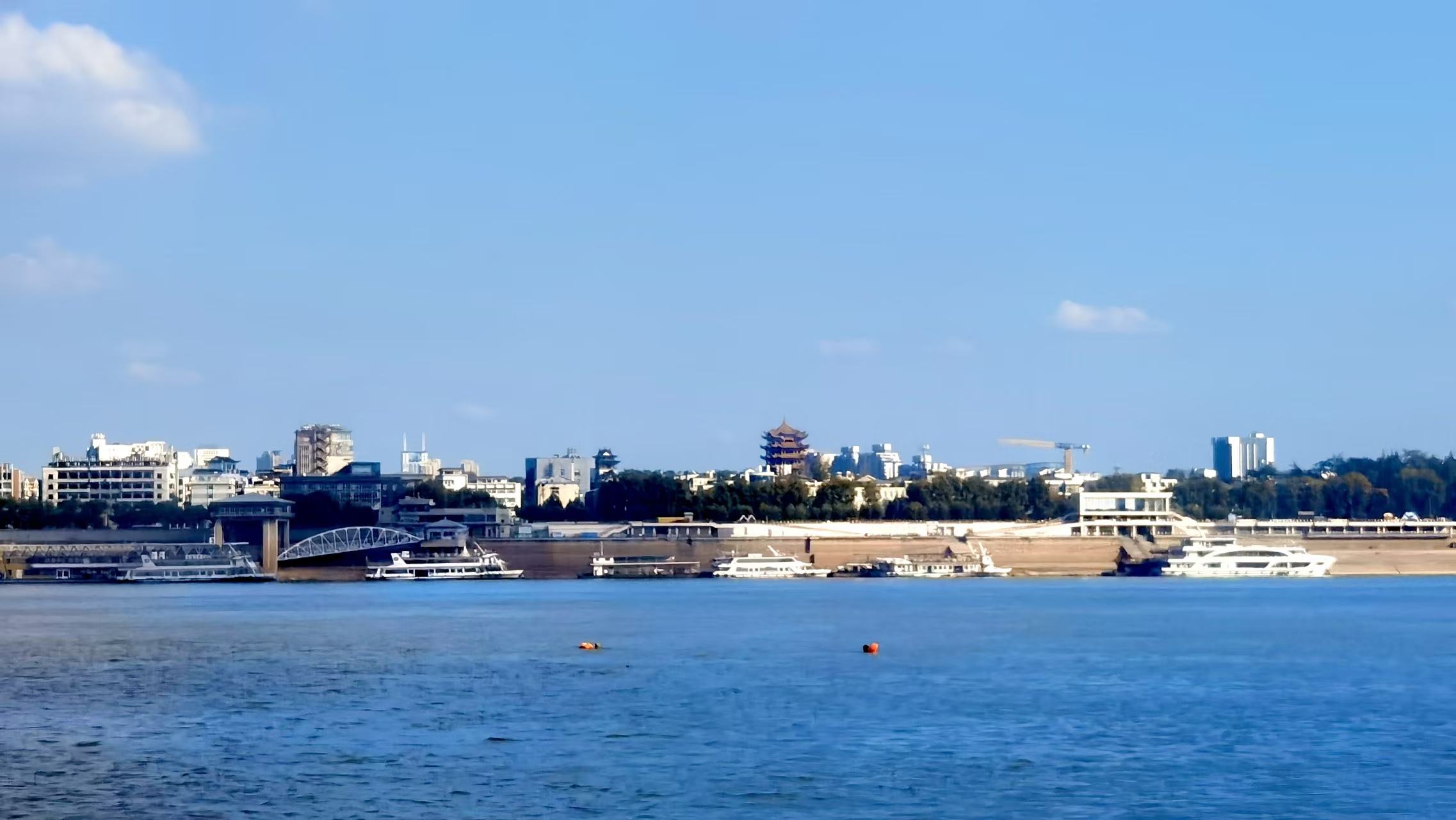 从轮渡上看晴川阁、黄鹤楼以及武汉长江大桥