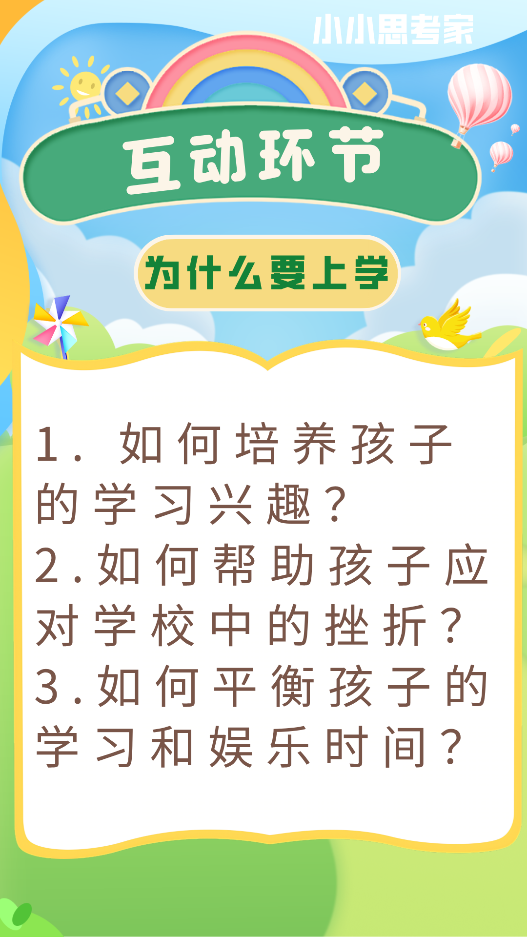 鼓励小朋友们分享他们对上学的想法,并强调学习和思考的重要性。