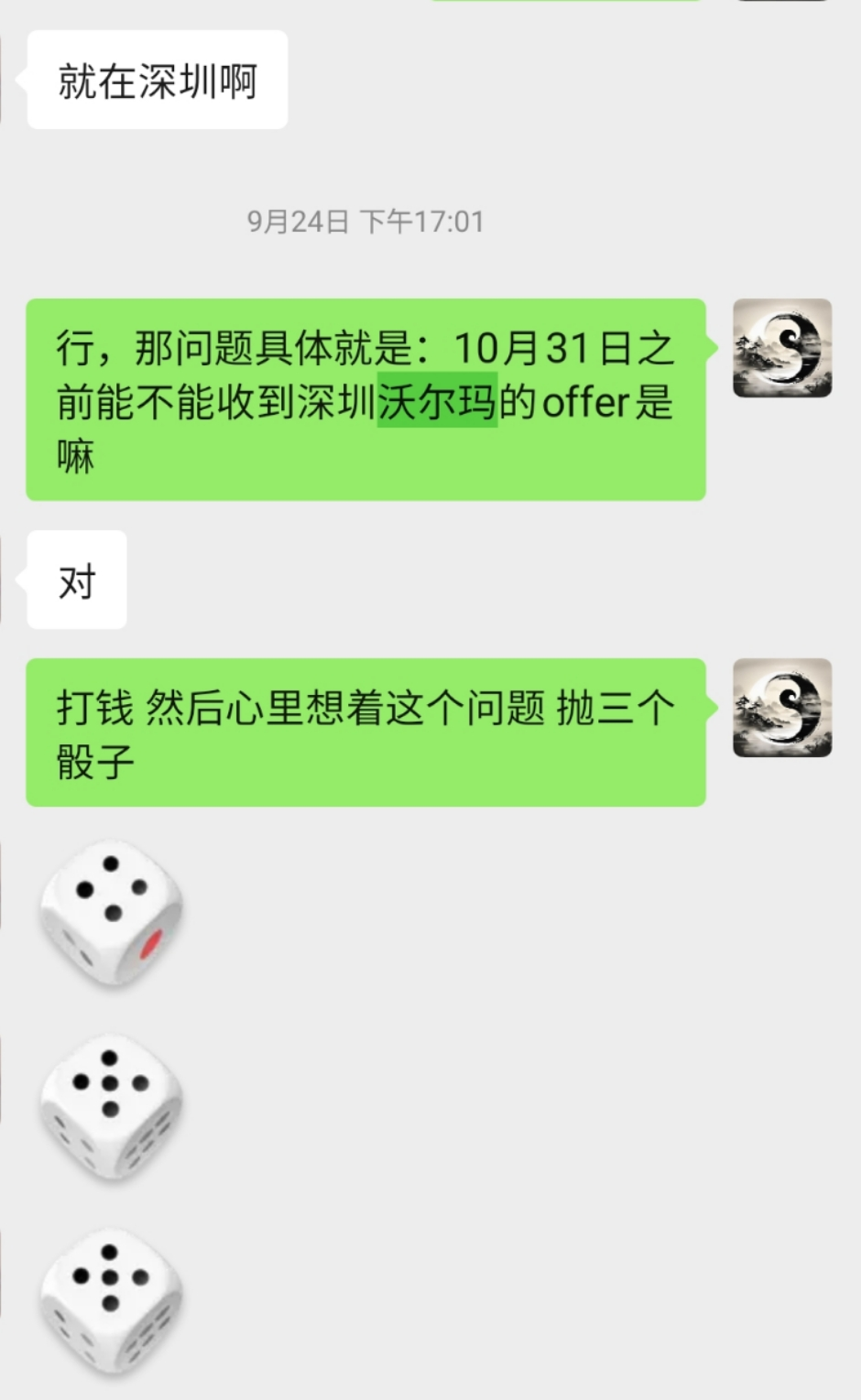 问题定位:10月31日前能否收到深圳沃尔玛的offer? 报数 —— 【赤口、留连、空亡】赤口: 寓意递交或申请过程可能有些麻烦留连: 寓意offer的申请流程会走得很慢空亡: 寓意最后是没有收到,或者无法如期收到聊天截图: