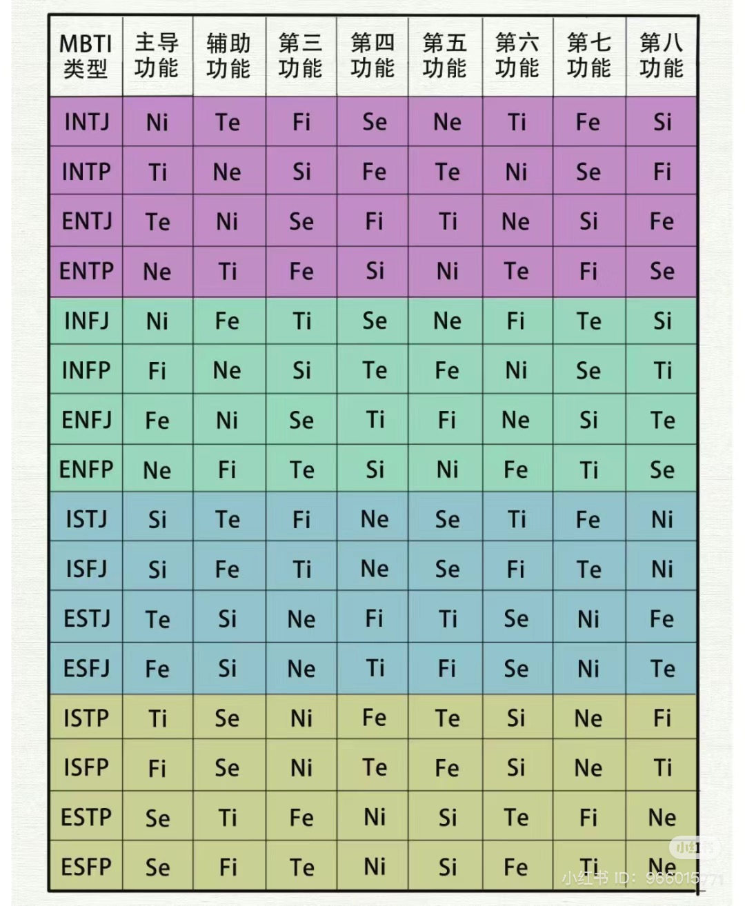 贴一个MBTI类型对应的荣格八大功能排序供大家参考: