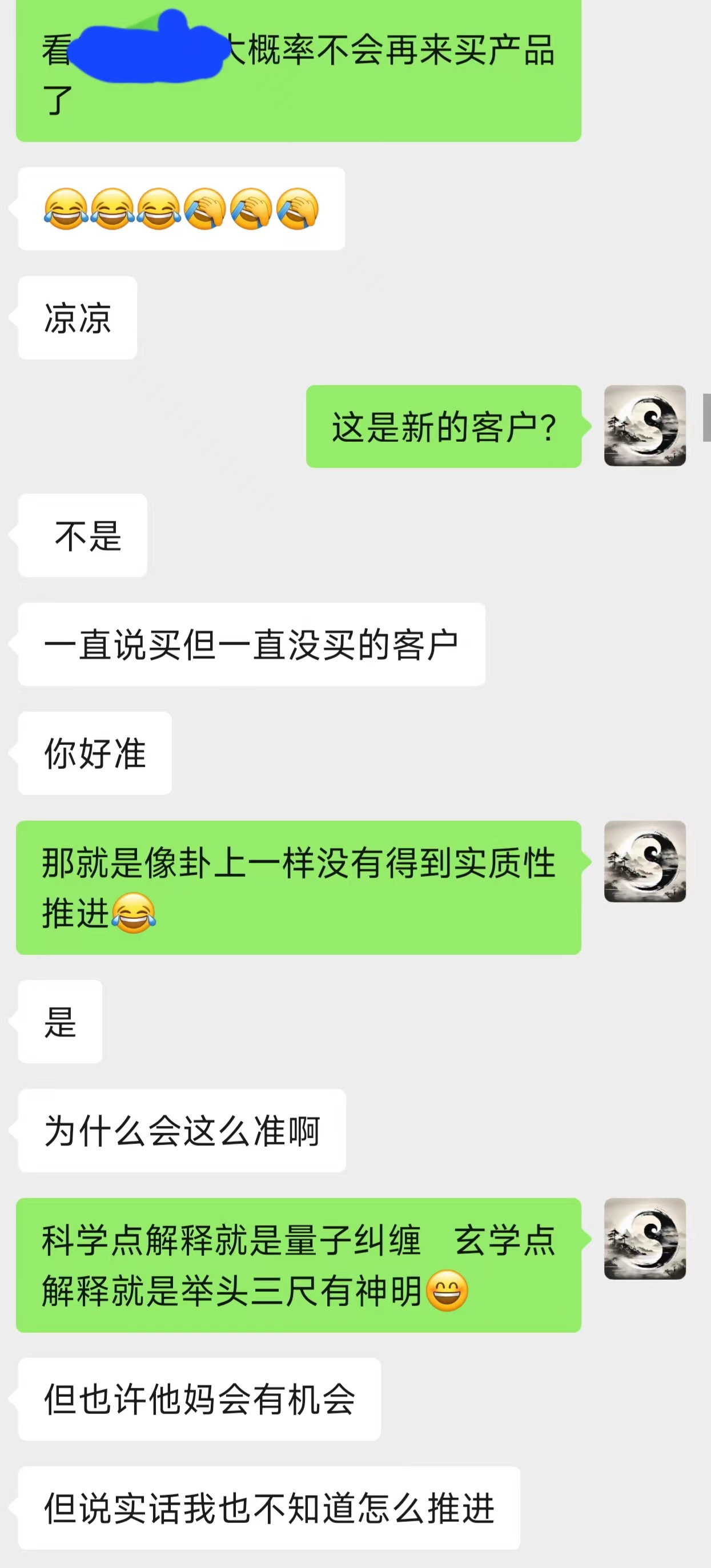 问题定位:刘先生还会再来找她买产品吗?报数:611 —— 【空亡、空亡、空亡】起因空亡:寓意一开始合作就不太稳定,或者说合作初期会有一些问题经过空亡:寓意两个人的合作没有进一步的进展结果空亡:代表这次合作想要继续会比较难聊天截图: