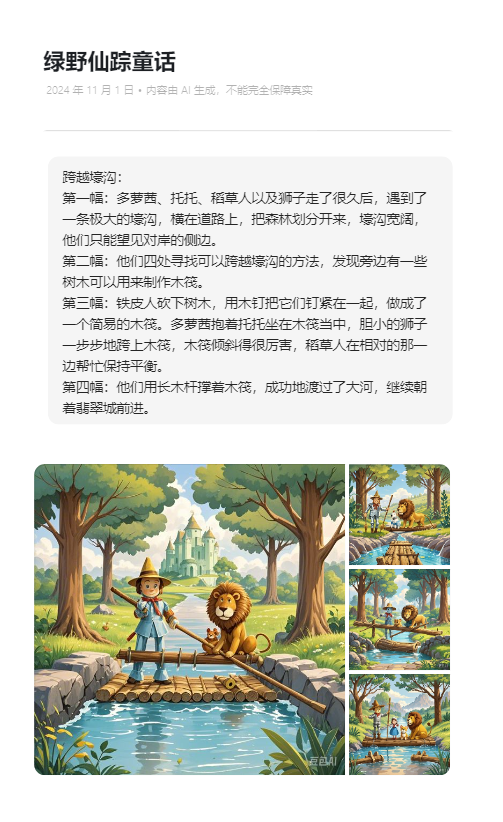 1.第一幅:多萝茜、托托、稻草人以及狮子走了很久后,遇到了一条极大的壕沟,横在道路上,把森林划分开来,壕沟宽阔,他们只能望见对岸的侧边。