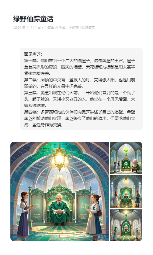4.第四幅:多萝茜和她的伙伴们向奥芝讲述了自己的愿望,希望奥芝能帮助他们实现,奥芝答应了他们的请求,但要求他们完成一些任务作为交换。