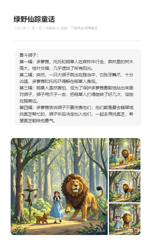 4. 第四幅:多萝茜告诉狮子不要伤害他们,他们都是要去翡翠城找奥芝帮忙的,狮子听后决定加入他们,一起去寻找奥芝,希望奥芝能给他勇气。