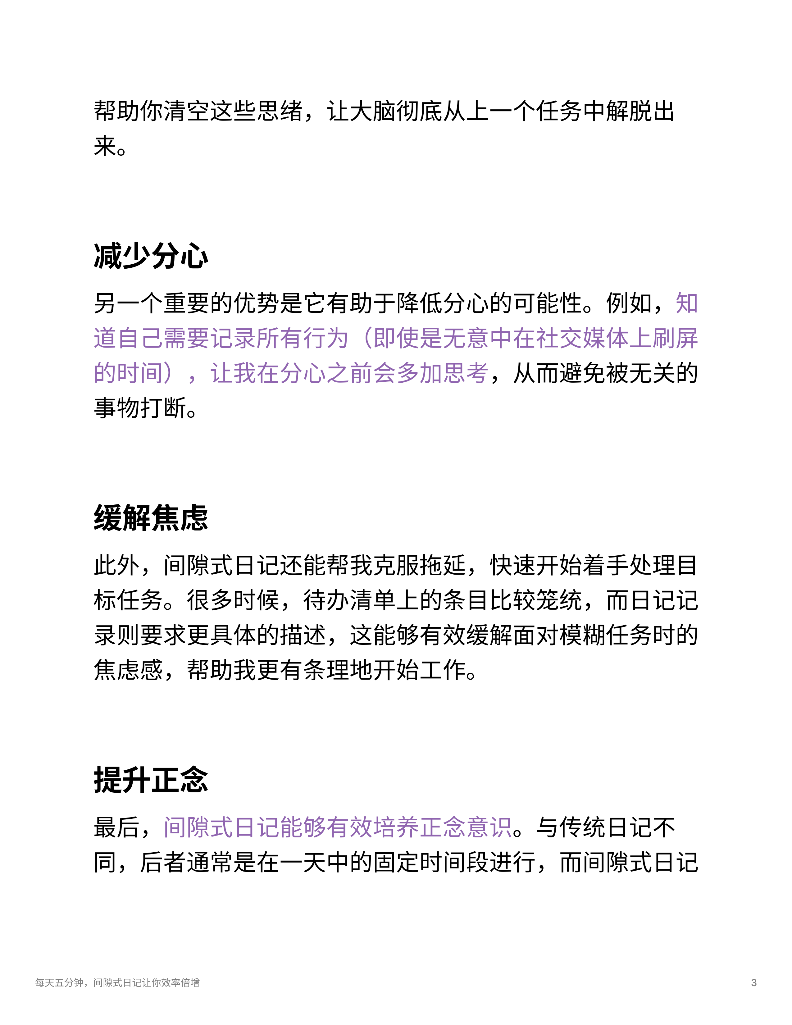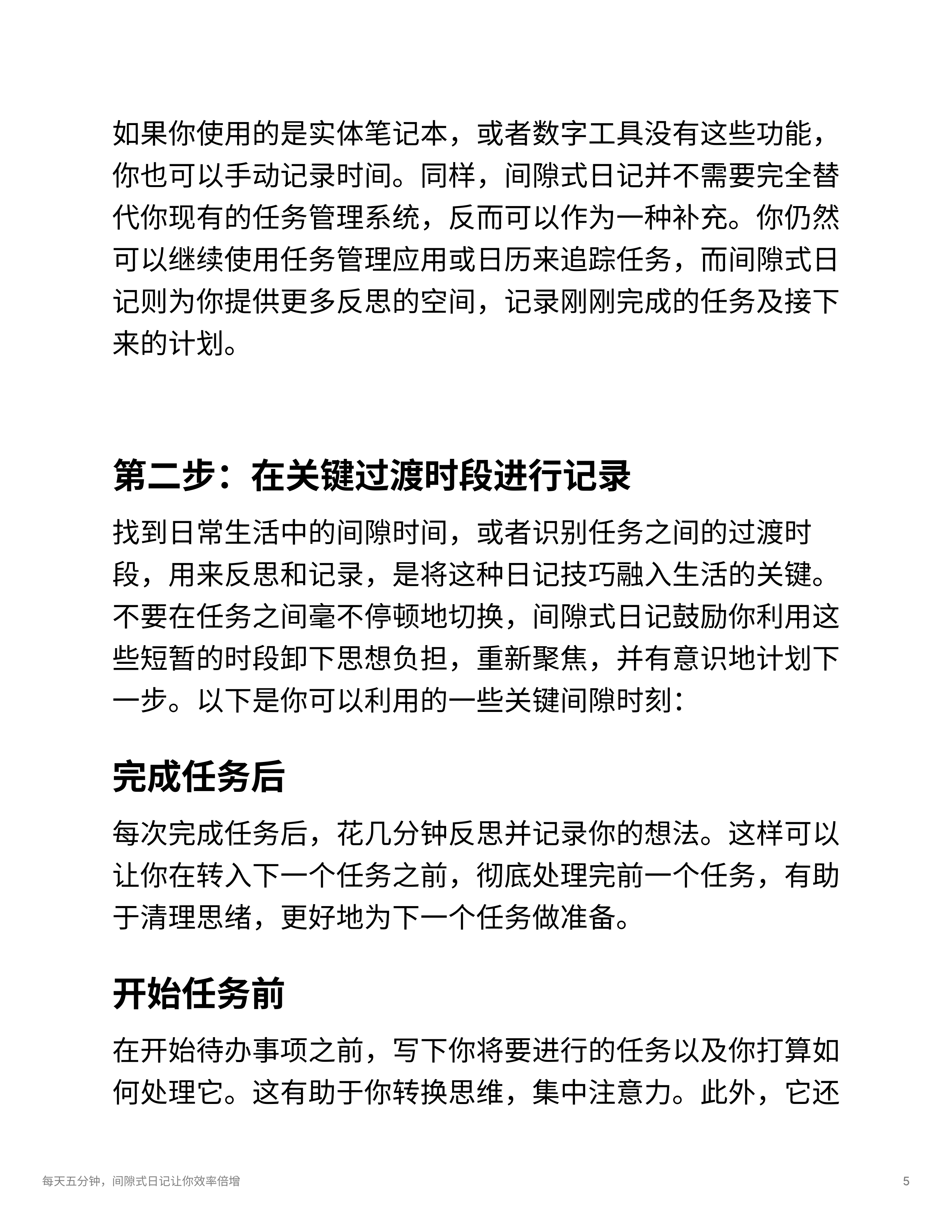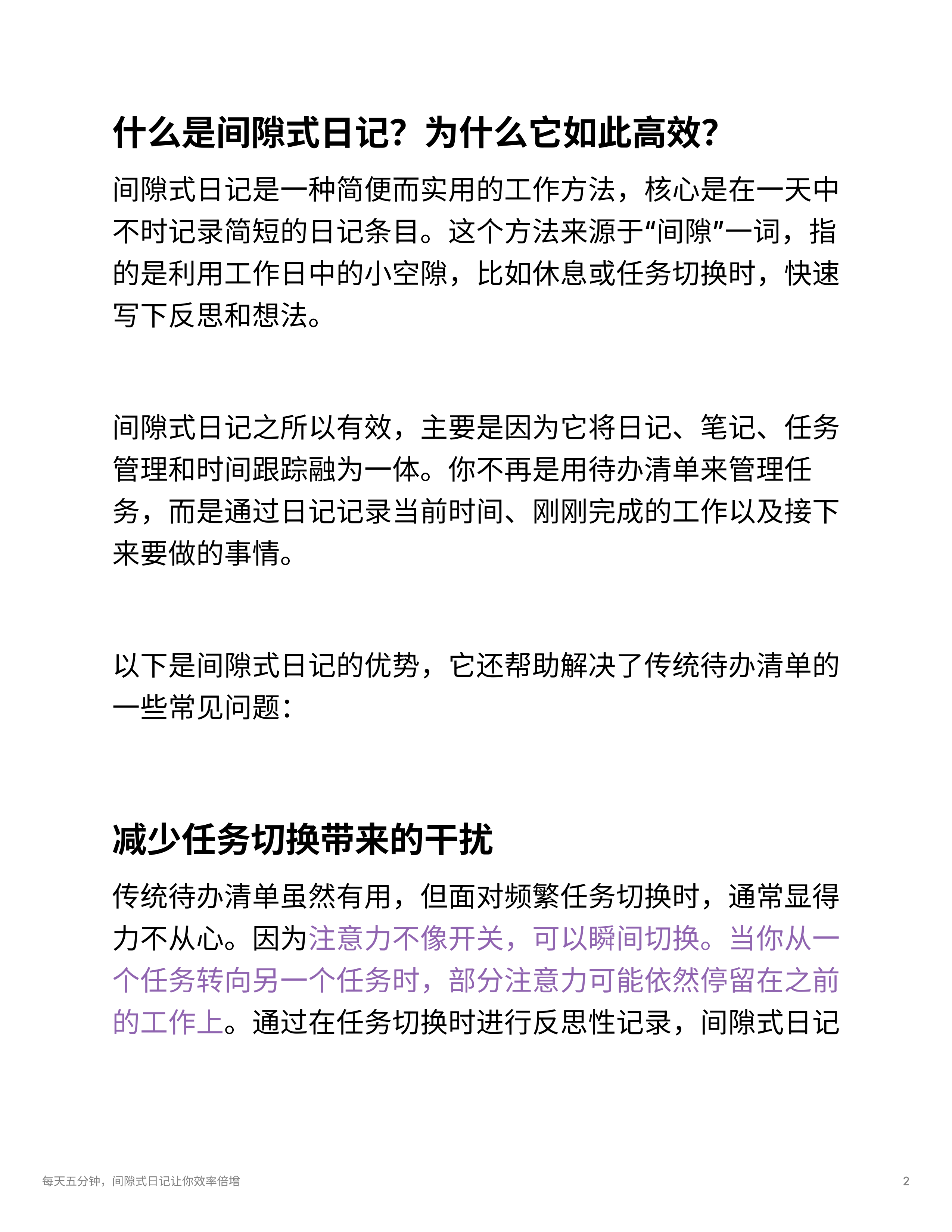 - 间隙式日记法可以通过短暂的记录帮助减轻任务转换中的注意力耗损,避免拖延和焦虑,提升正念和专注度。