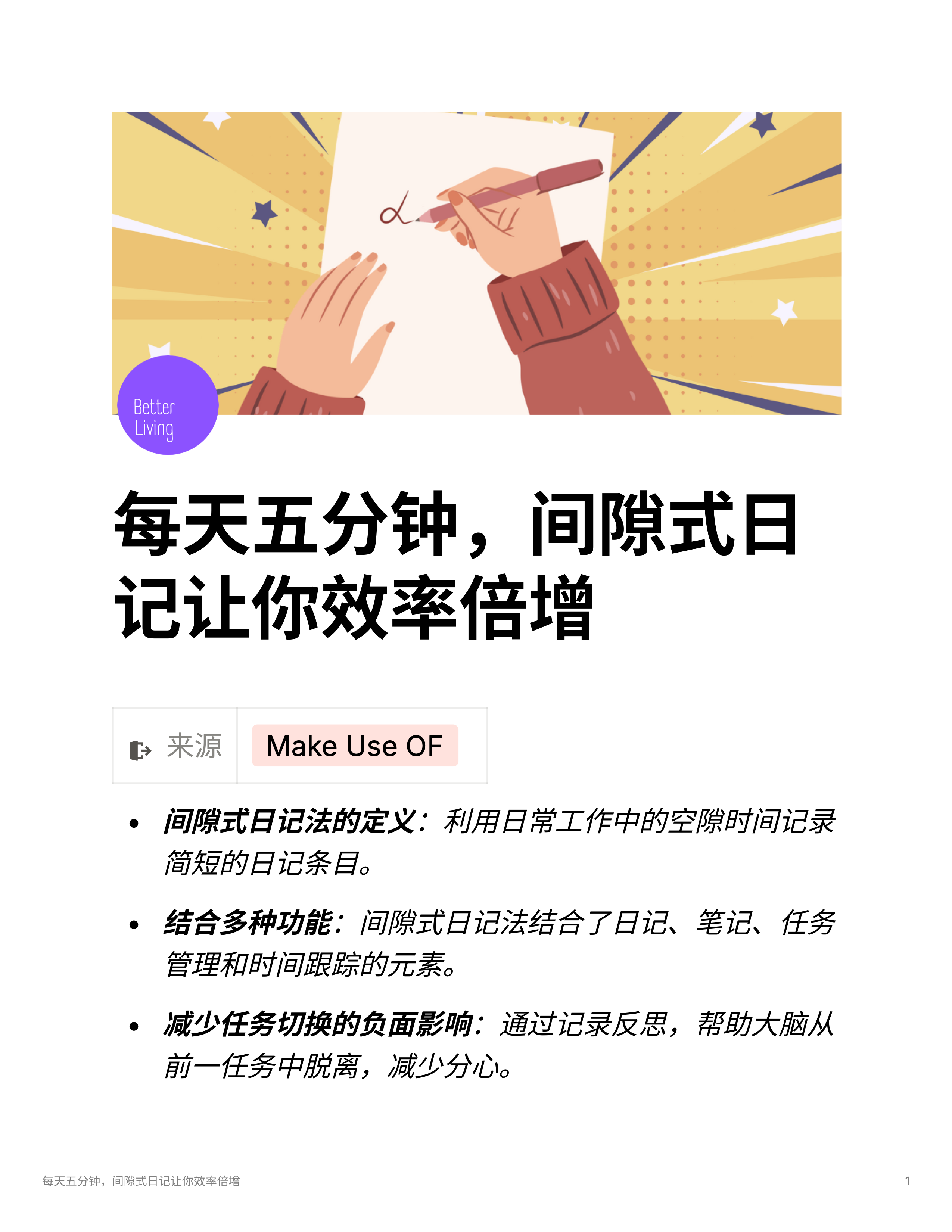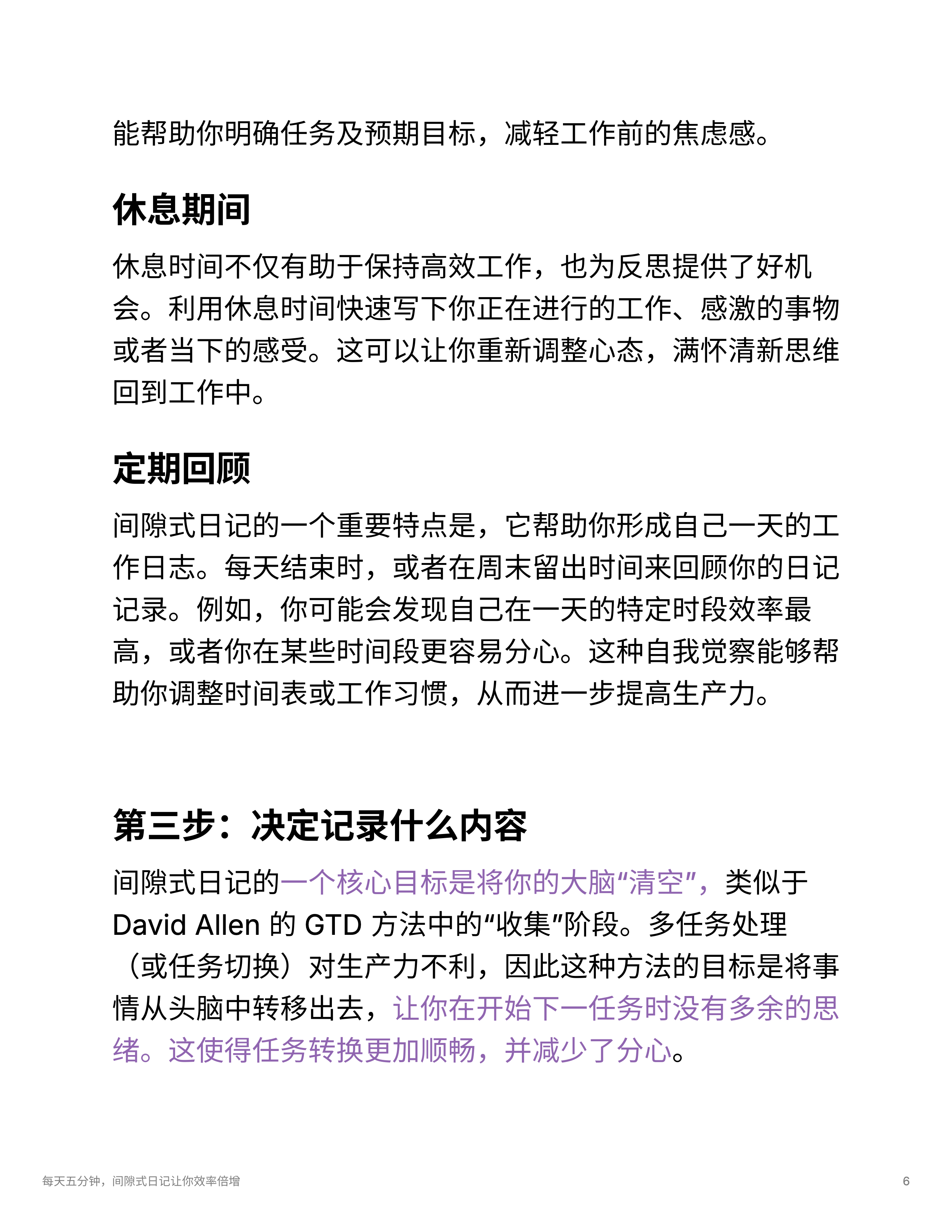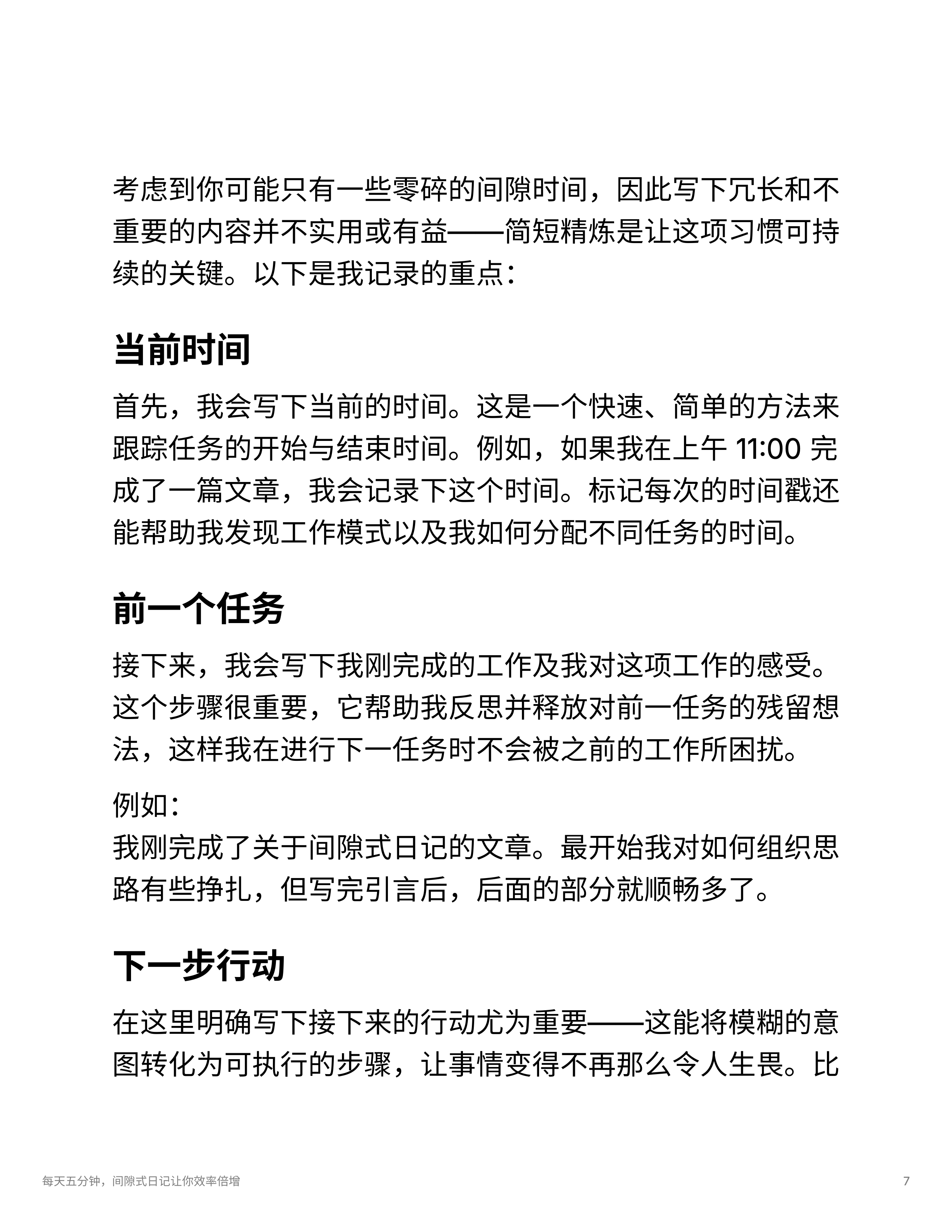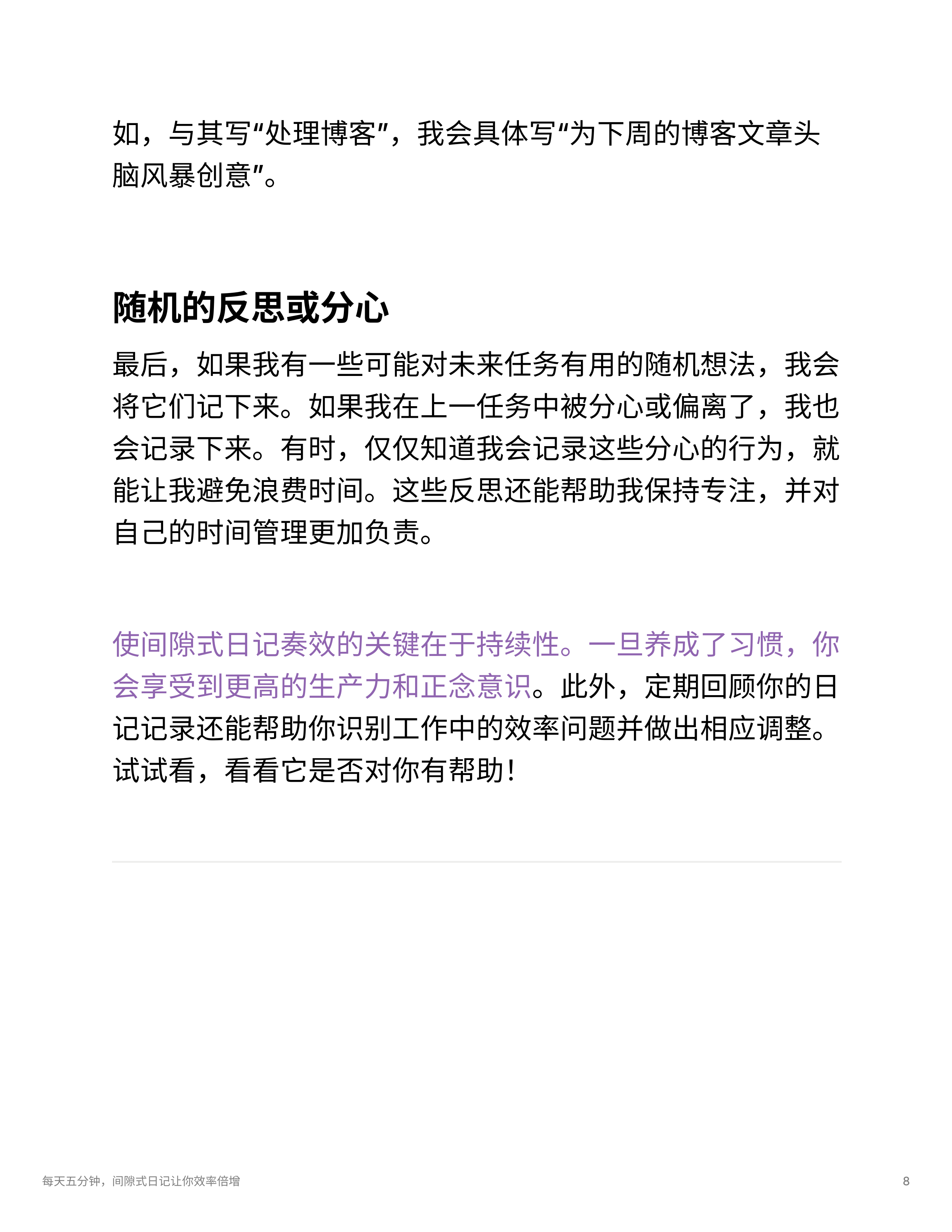 - 间隙式日记法可以通过短暂的记录帮助减轻任务转换中的注意力耗损,避免拖延和焦虑,提升正念和专注度。