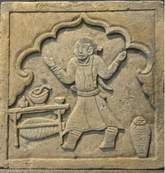 开芳宴壁画1984年出土于洛阳新安县李村北墓中,由铭砖可知这幅壁画的绘制时间是宋钦宗靖康元年(公1123年)。宋人将一边饮酒喝茶一边观赏歌舞杂剧表演这样的场面称之为开芳宴,用这种方式表达夫妻恩爱之情。壁画上方是竖起的竹帘和幔帐,幔帐之下有一架屏风,屏风之前是夫妻二人身子微侧的坐在摆满茶酒和食物的桌前,二人左右是叉手站立侍奉的侍从。