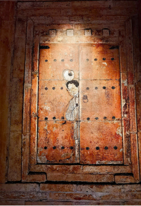 门扉半掩中一个头戴团冠、身着青色上衣,白色裙子的女子,从两扇门中露出半个身子,似在向外观望。