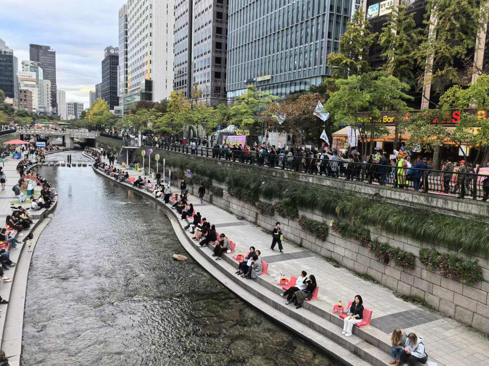 清溪川边的悠闲与街上的游行: