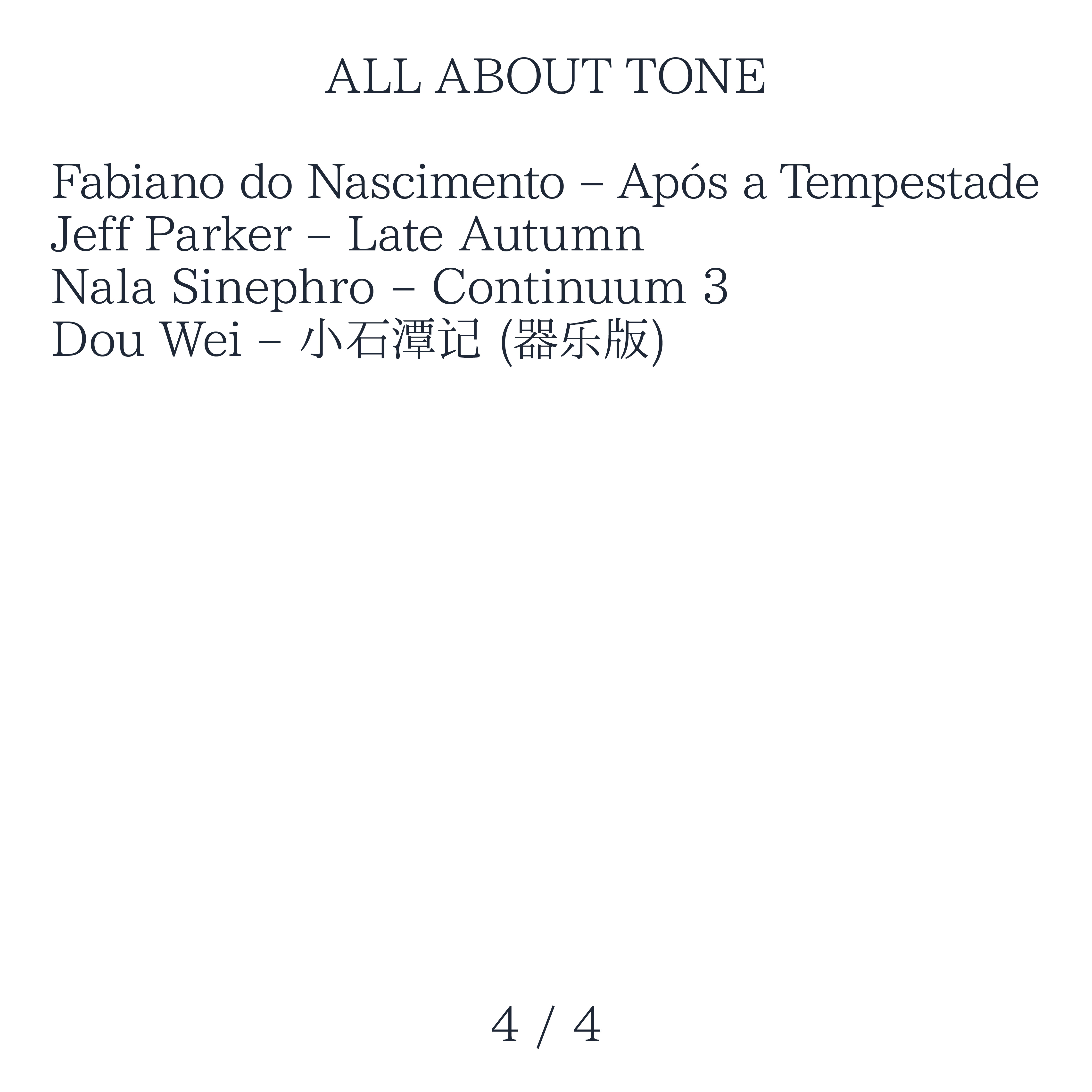 ALL ABOUT TONE, 音乐让人产生美好的共鸣,这种感觉跨越流派与时代,我们称之为"调律"。无论在人声调式、乐器音色或颇具特色的制作、混音方式,汇集"调律"的探索,乐此不疲。