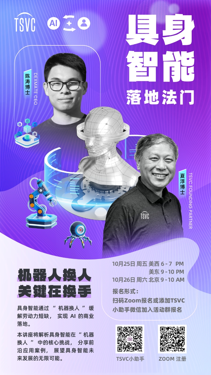 10月26日TSVC举办了《打造下一个独角兽》讲座第34讲。当前AI的泡沫化突出表现在商业化落地的困难,然而具身智能把AI通过机器人运用到物理空间,在机器换人,缓解劳动力短缺方面立竿见影,商业上迅速落地产生效益。然而机器换人在技术上挑战极大,尤其是机器换人手。本讲座解析具身智能在“机器换人”中的核心挑战,分享前沿应用案例,展望具身智能未来发展的无限可能。
