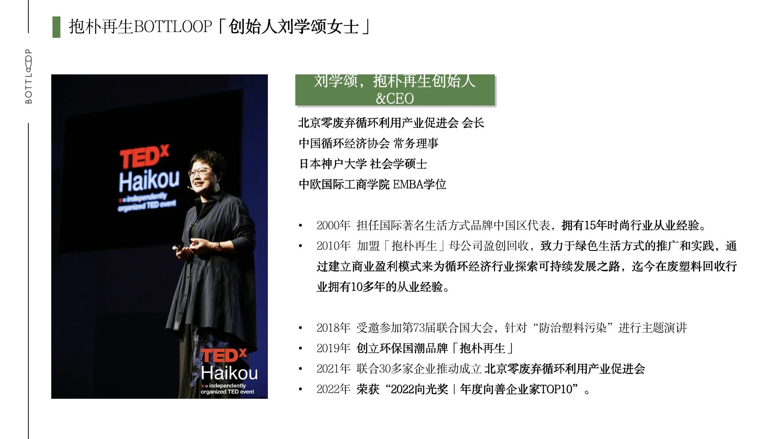抱朴再生创始人兼总经理刘学颂,在2010年前担任国际著名⽣活⽅式品牌中国区代表,辞职回国后,于2010年加入中国唯一一家可以生产食品级再生聚酯切片的企业——盈创回收,刘学颂的主要工作是将回收的塑料瓶做成食品级材料,形成真正的循环经济。2018年,刘学颂创立环保国潮品牌抱朴再生BOTTLOOP,为企业和品牌提供环保可持续发展的整体解决方案,并向年轻消费人群推出贴近自然与美学理念的再生潮品。