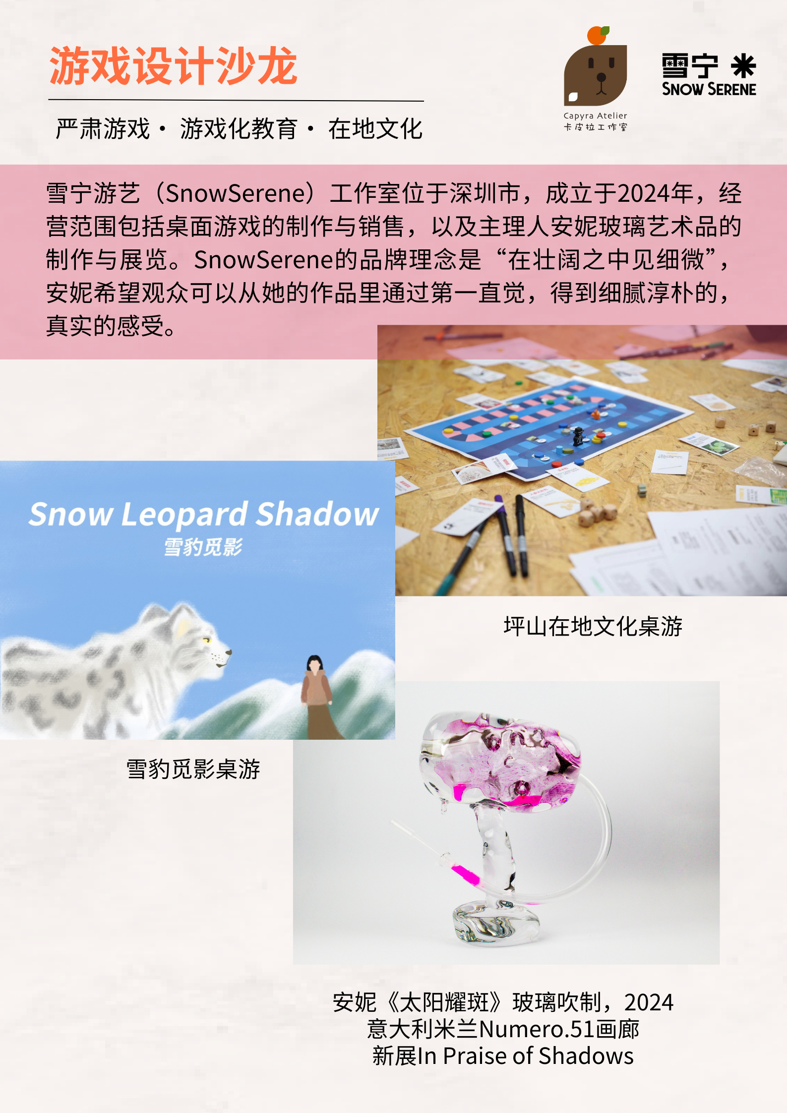 雪宁游艺(SnowSerene)工作室位于深圳市,成立于2024年,经营范围包括桌面游戏的制作与销售,以及主理人安妮玻璃艺术品的制作与展览。SnowSerene的品牌理念是“在壮阔之中见细微",安妮希望观众可以从她的作品里通过第一直觉,得到细腻淳朴的,真实的感受。