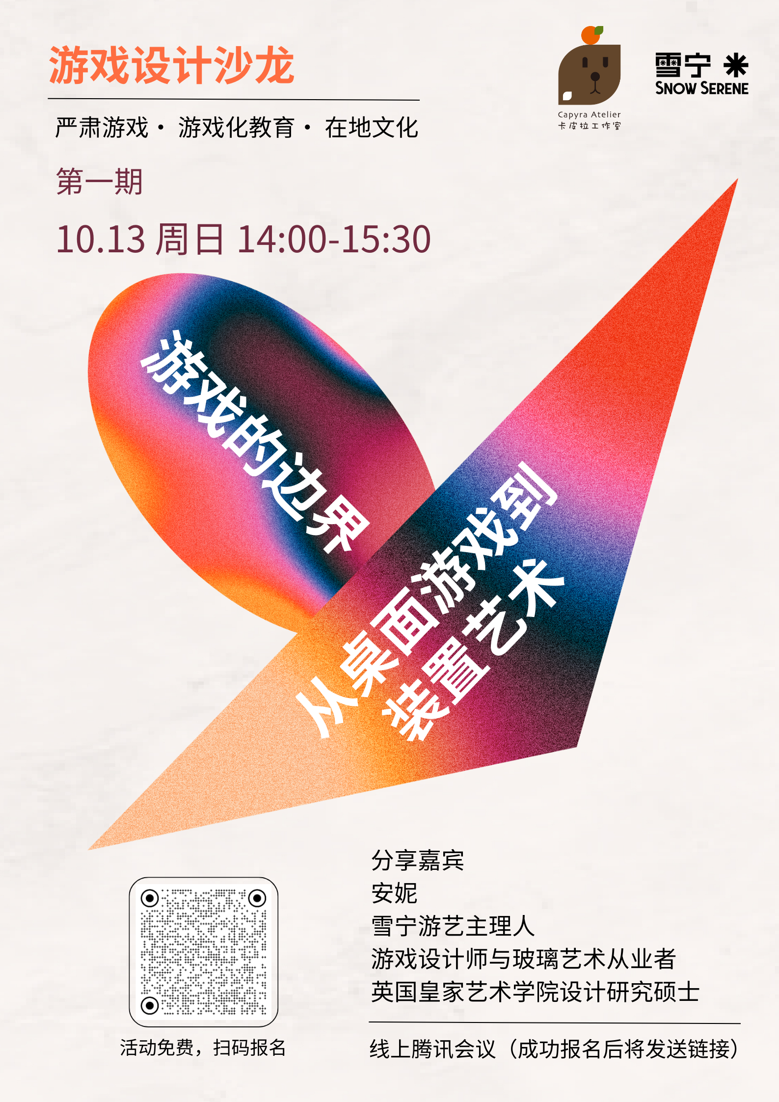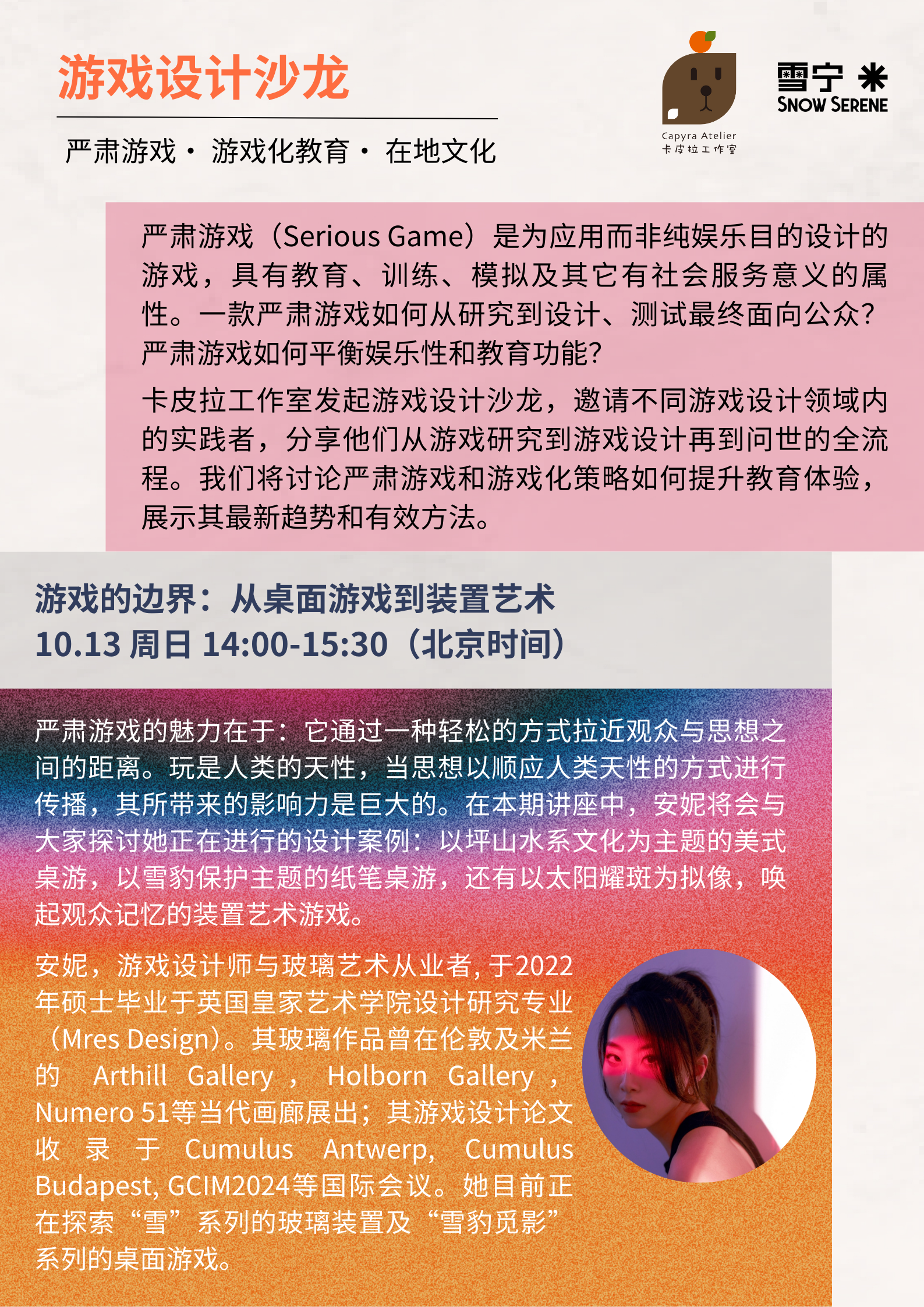 严肃游戏的魅力在于:它通过一种轻松的方式拉近观众与思想之间的距离。玩是人类的天性,当思想以顺应人类天性的方式进行传播,其所带来的影响力是巨大的。在本期讲座中,安妮将会与大家探讨其正在进行的设计案例:以坪山水系文化为主题的美式桌游,以雪豹保护主题的纸笔桌游,还有以太阳耀斑为拟像,唤起观众记忆的装置艺术游戏。
