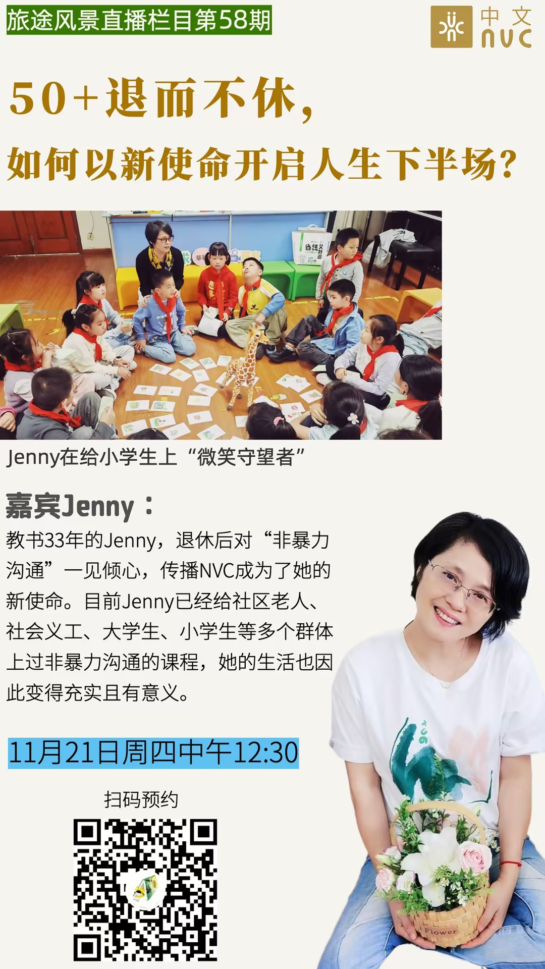 50+退休老师的NVC传播之路!本期嘉宾Jenny,退休后对“非暴力沟通”一见倾心,传播NVC成为了她的新使命。目前她已经给社区老人、社会义工、大学生、小学生等多个群体上过非暴力沟通的课程,她的生活也因此变得充实且有意义。