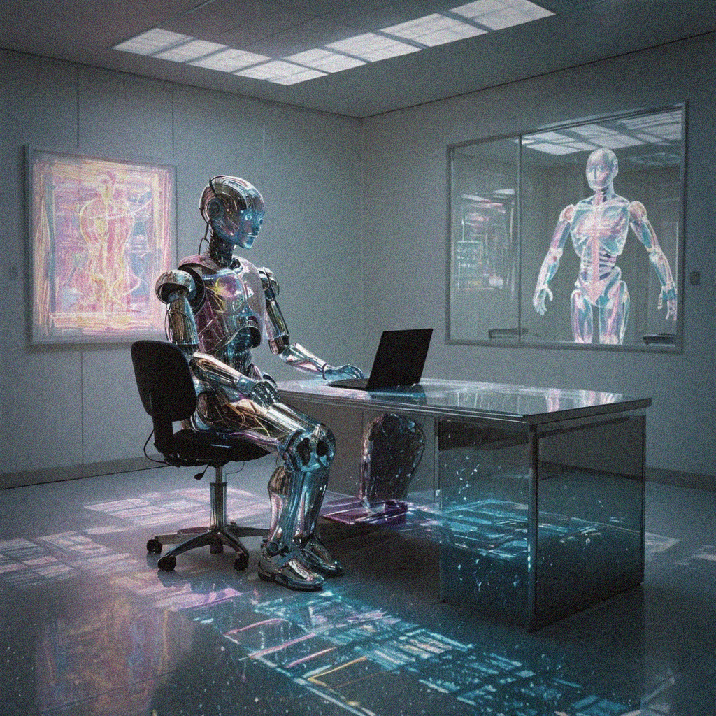 它优雅地坐在接待台前,面前是关于人类文明的档案。里面有关于人类最后几代的悲惨记录:过度依赖技术、生育率骤降、免疫系统崩溃。一部关于文明自我毁灭的教科书式档案。