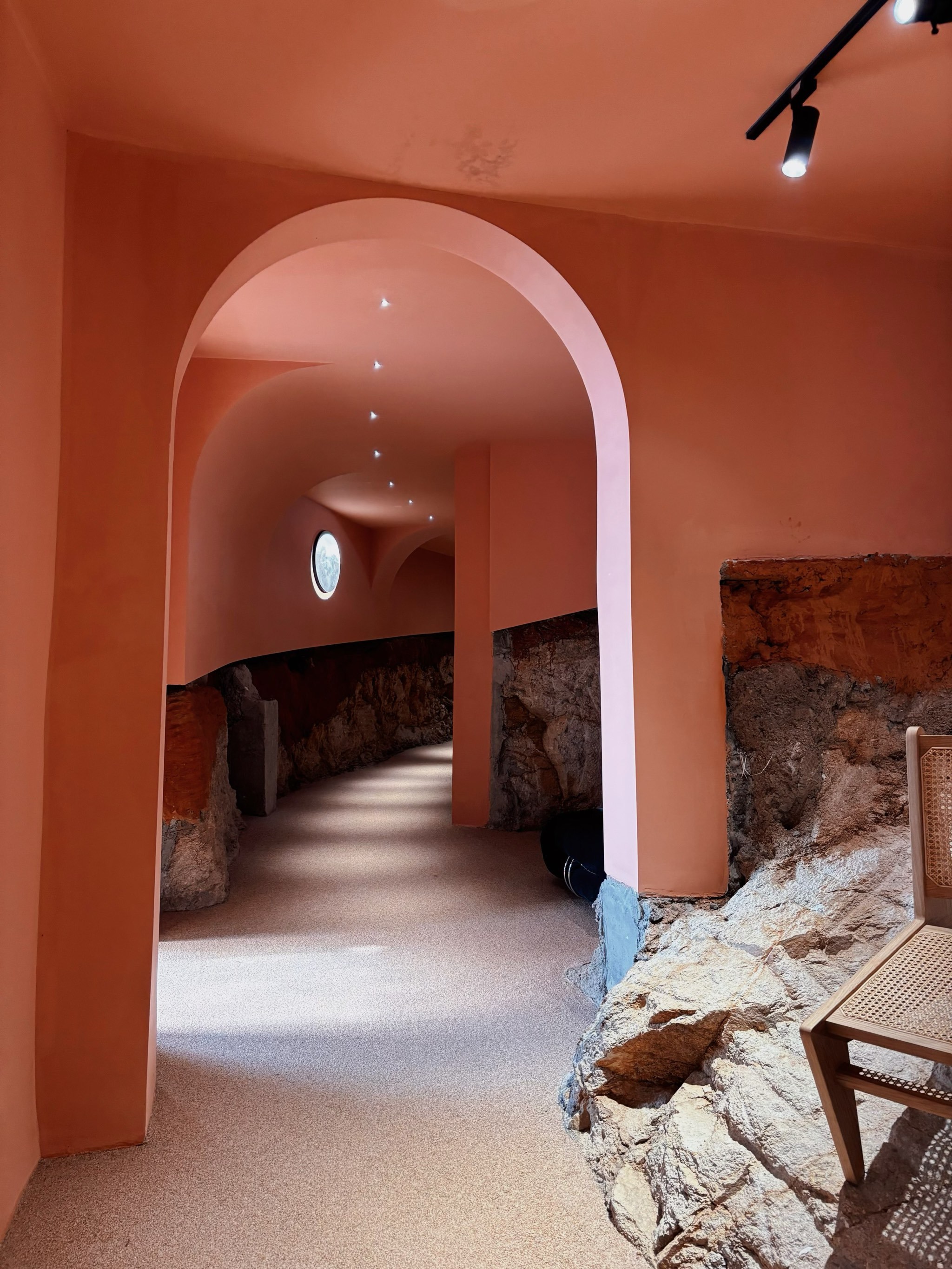 为什么会在这里录制呢?得从我的一个老朋友刘姐说起,她从大学辞任老师的工作之后,就在宁波做起了家居生意,一做也近30 年了。今年我突然发现她有很多的新动静,其中一个就是在这个洞穴美术馆里布置了一场展览。把原本摆放在家居卖场的进口座椅搬到美术馆之后,我发现,无论是原本曲高和寡的艺术作品,还是商品属性明确的沙发座椅,都得到了一个更加柔和且具象的艺术生活场景。将艺术生活场景化,将家居产品艺术化,非常巧妙!