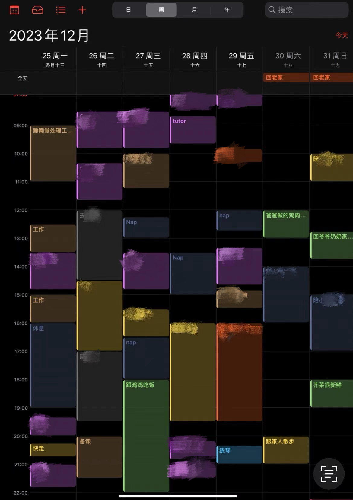 🔧工具:苹果日历、提醒事项、日记本(工具不重要,重要的是长期坚持)。参考了纵横四海的两期节目《时间贫困》 《精力管理》,我对时间的觉知变得更强,且会主动从生活的各个方面给精力不断充电放电,使其张弛有度,保持健康的波动。