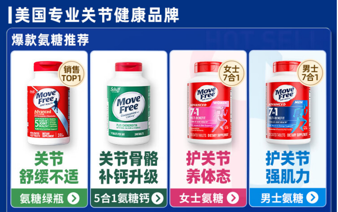 MoveFree 益节 氨糖软骨素——美国专业关节健康品牌,连续 7 年天猫国际氨糖品类销售 TOP1,100% 纯进口,产品通过了中国质量检验协会和美国FDA的双重认证。