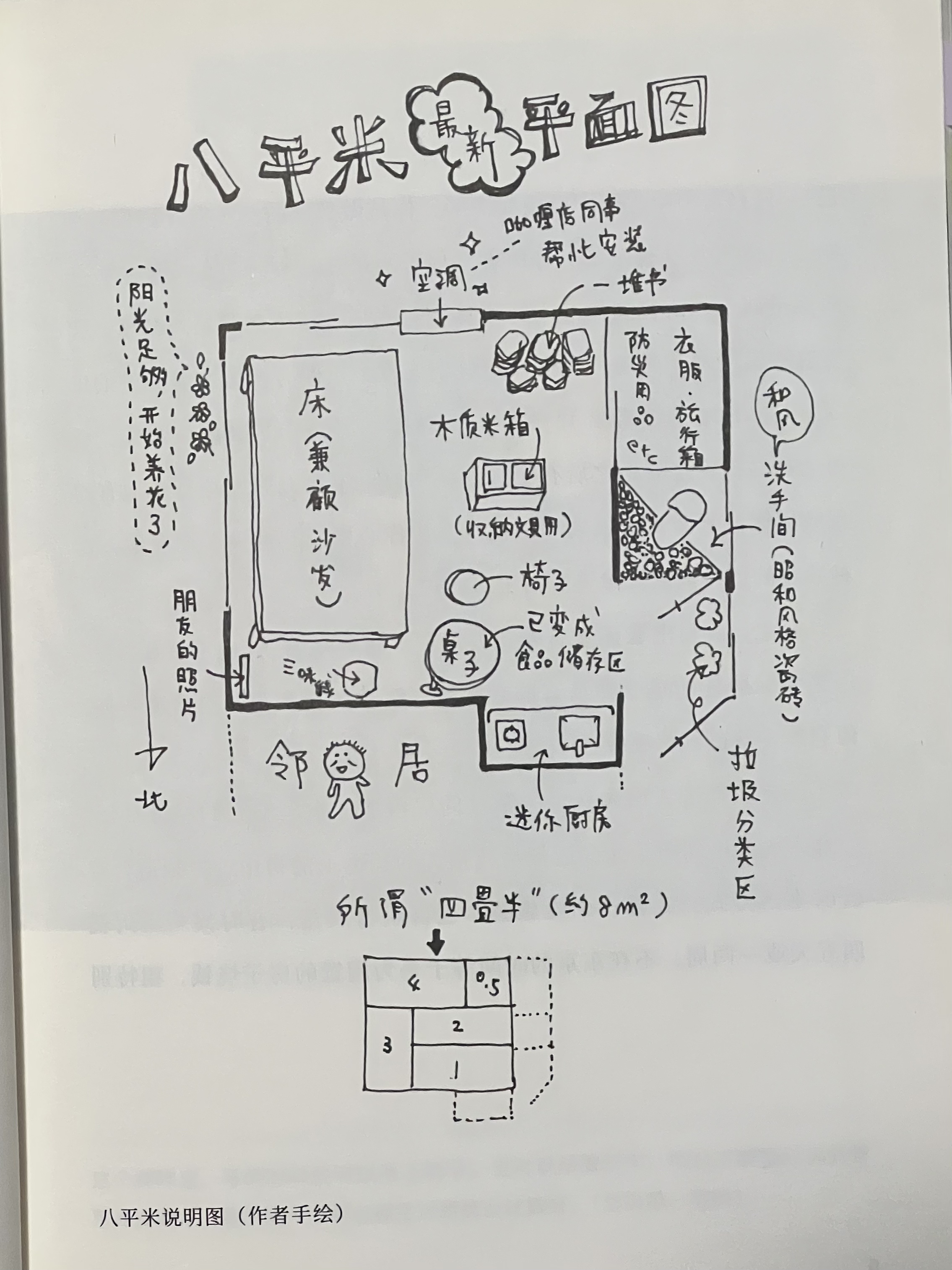 这本书记录了吉井忍在东京租住的八平米房间中的生活。她讲述了如何在没有厨房、冰箱、洗澡间和洗衣机的狭小空间中生活,以及她如何将生活延伸到城市的街头和公共空间的故事,其中关于如何平衡物质经济和身心自由的部分很值得我们借鉴。