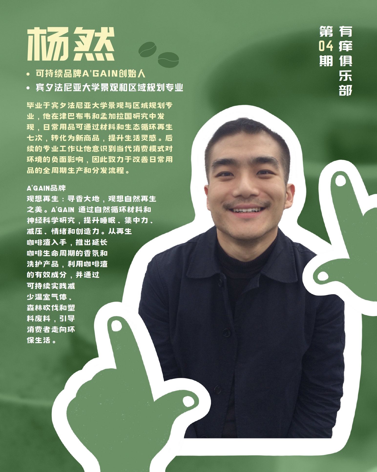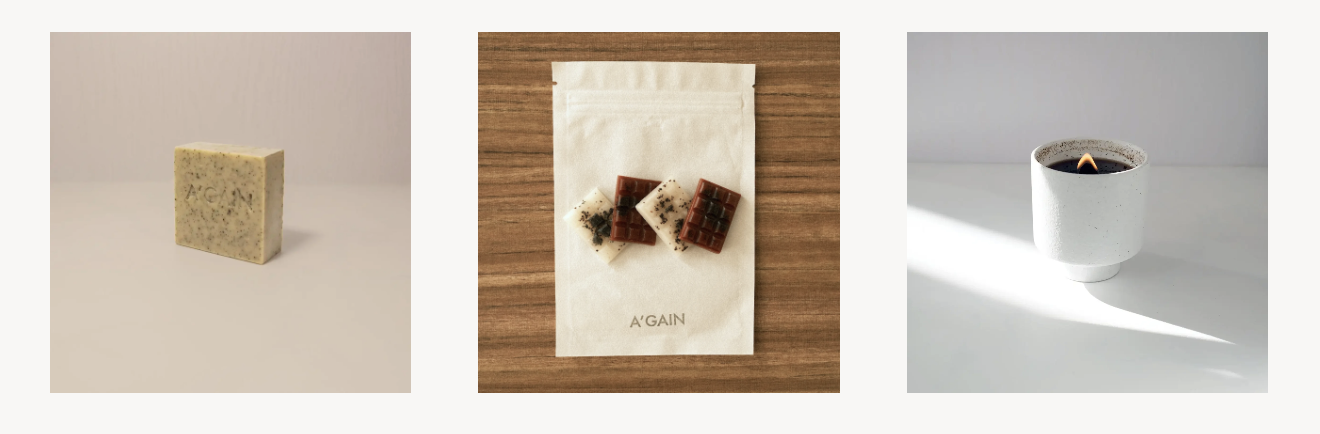 助眠,集中,减压,启迪。用自然循环原料的神经科学研究激发灵感,提升意识力,情绪力,记忆力和想象力和创造力。自然再生的力量 让自己再生。从再生咖啡渣开始,逐步推出延长咖啡生命周期的香氛和洗护产品线,通过深入研究使咖啡渣成为其中的能够感知到的有效成分 A'GAIN通过全身全程可持续实践减缓现行消费行为产生三类环境问题: 温室气体 森林砍伐 塑料废料 帮消费者感知环保 观想自然