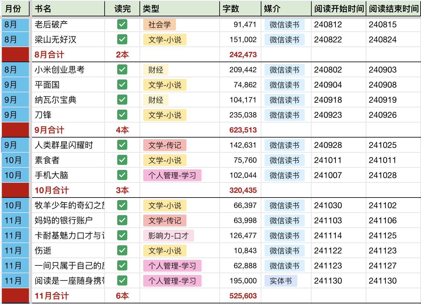 我从去年开始会做每个月的阅读复盘,将该月读完的书都简单地进行总结。刚开始是每月一次,后来是2个月一次,今年下半年因为比较忙,所以频率更低了,上周才把8-11月这4个月的阅读情况合起来做了个总结。