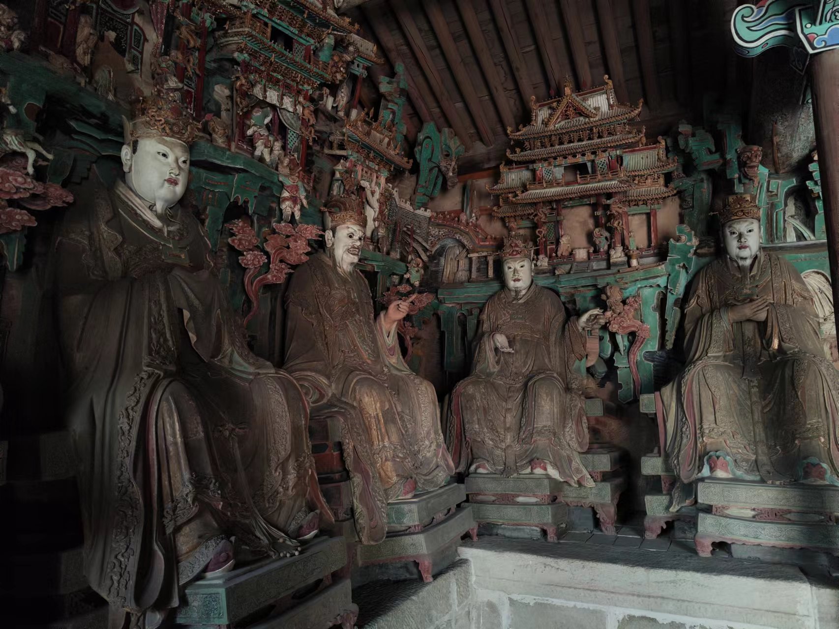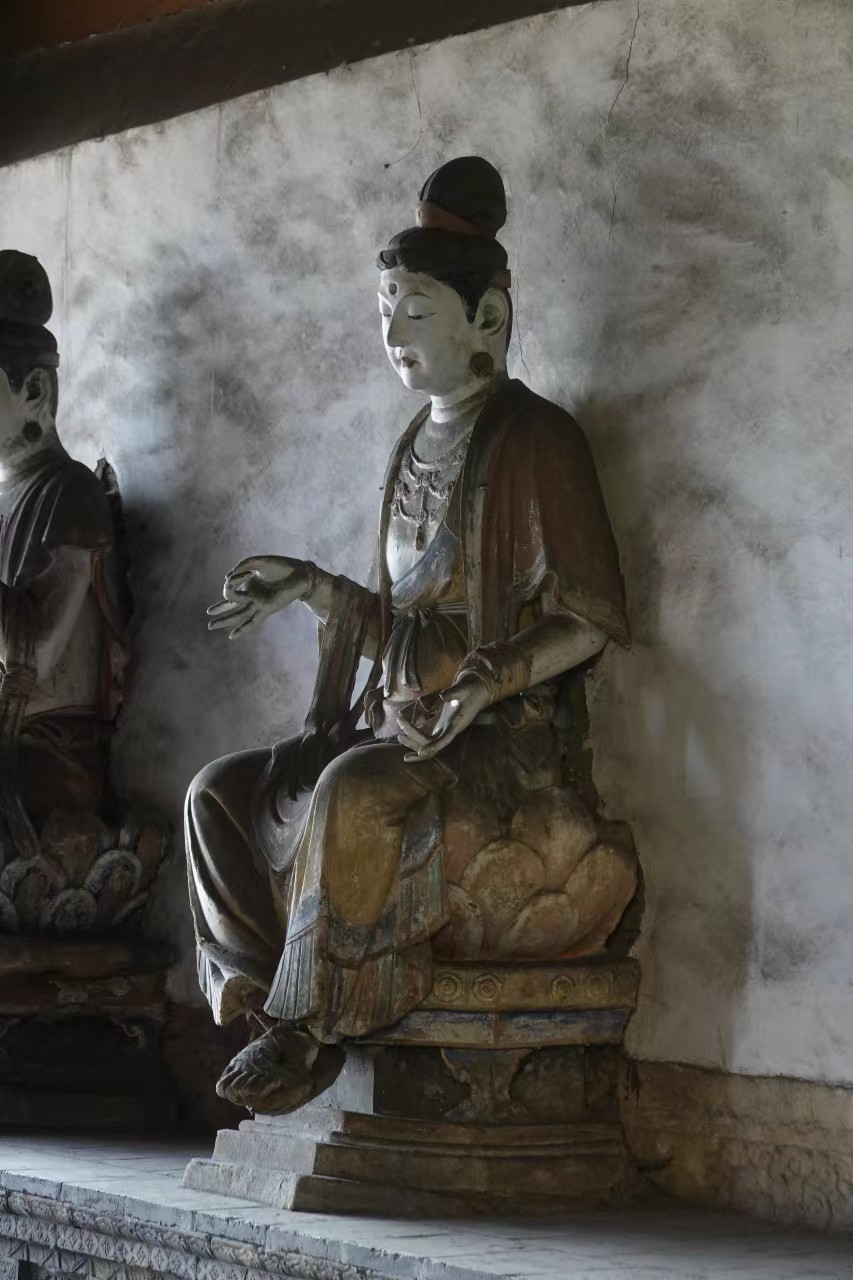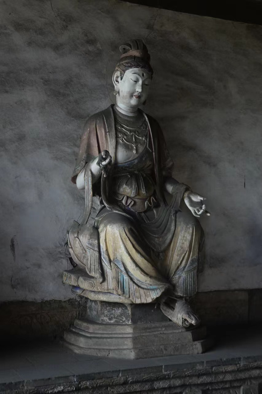 十二圆觉彩塑系宋大观元年至政和元年(1107~1111)塑成,面相圆润清秀,高髻变化各异,衣纹转折自然,肌体丰润健美,乃上承唐风又寓有写实风格的宋代雕塑佳品