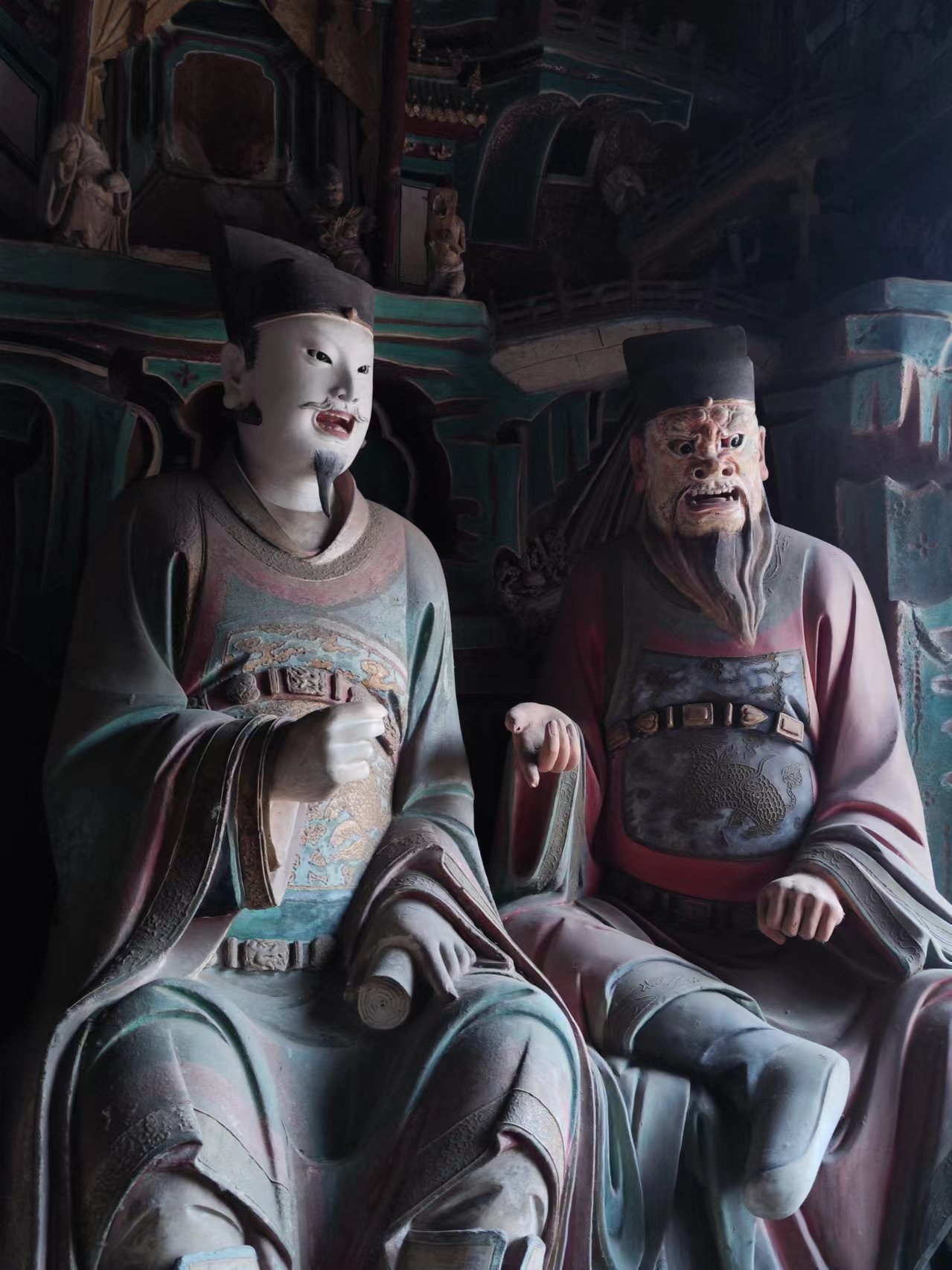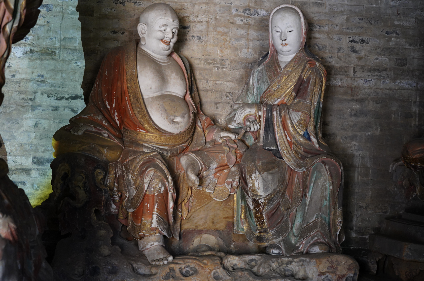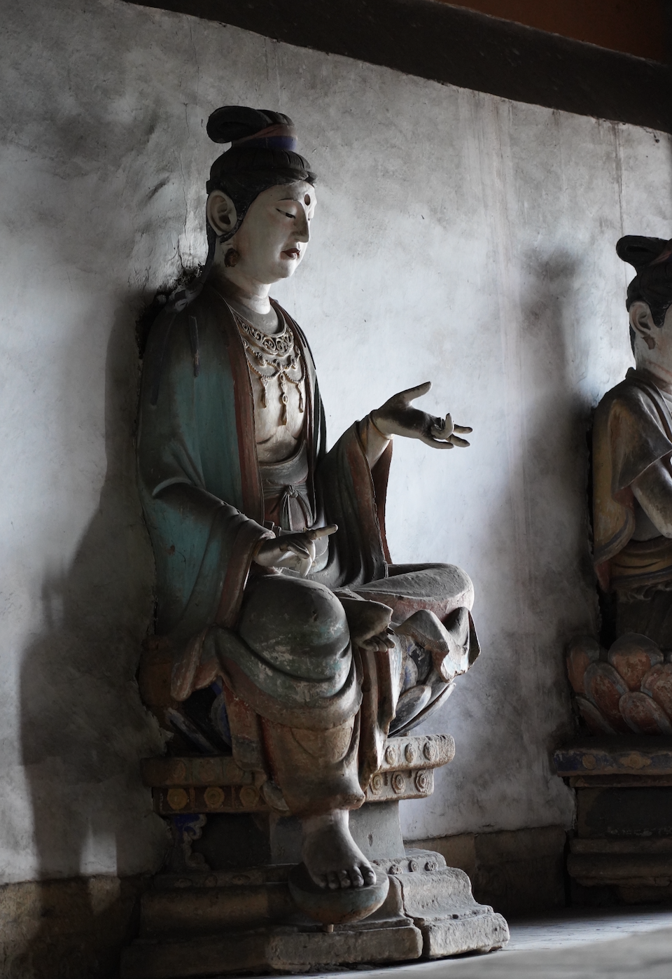 十二圆觉彩塑系宋大观元年至政和元年(1107~1111)塑成,面相圆润清秀,高髻变化各异,衣纹转折自然,肌体丰润健美,乃上承唐风又寓有写实风格的宋代雕塑佳品