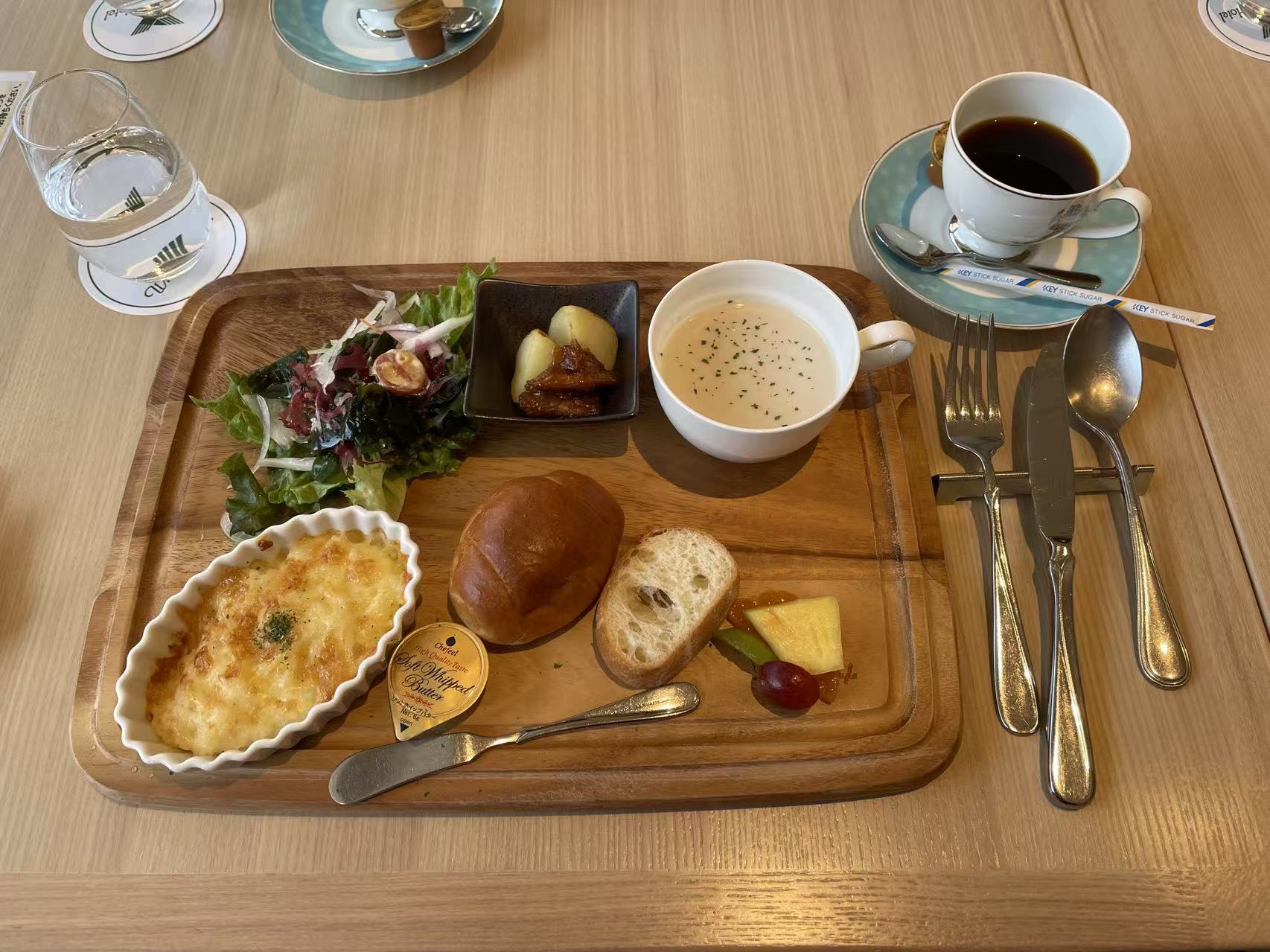 主食盘:蔬菜沙拉、奶油汤、土豆芝士、面包配黄油、水果