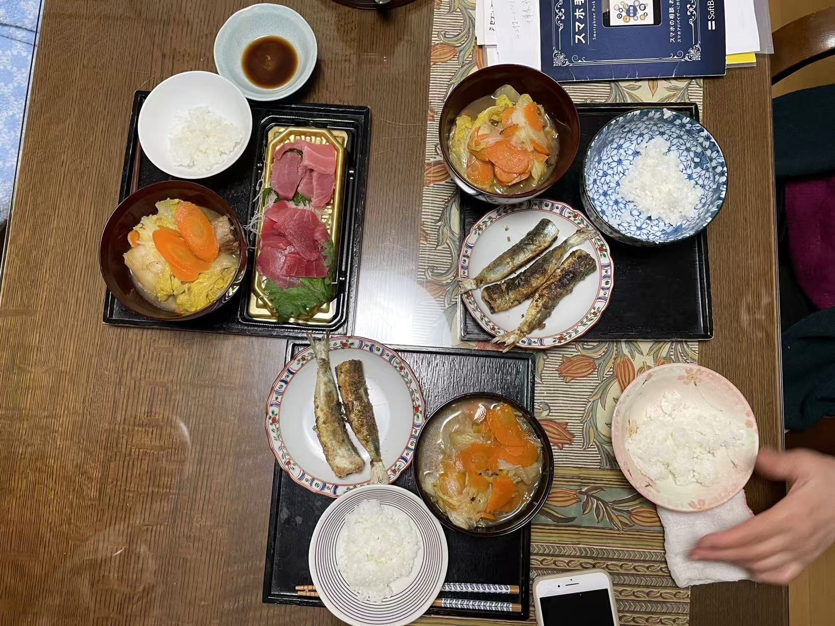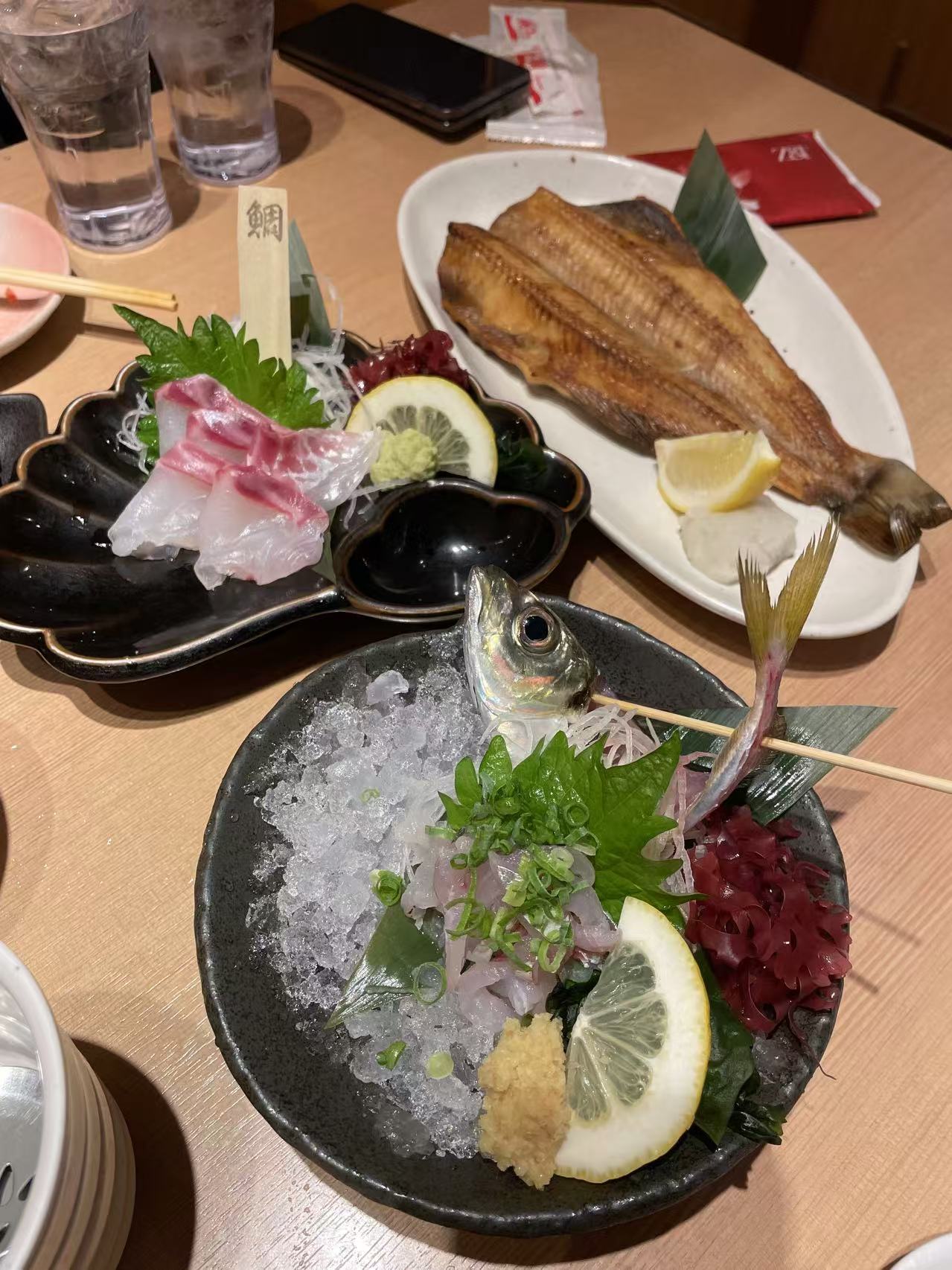 煎鱼、烧肉炖白菜粉条胡萝卜、金枪鱼刺身