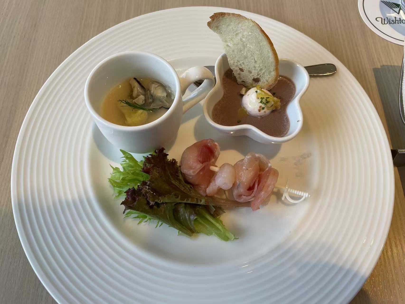 前菜盘:鱼肉串、牡蛎羹、面包配豆酱