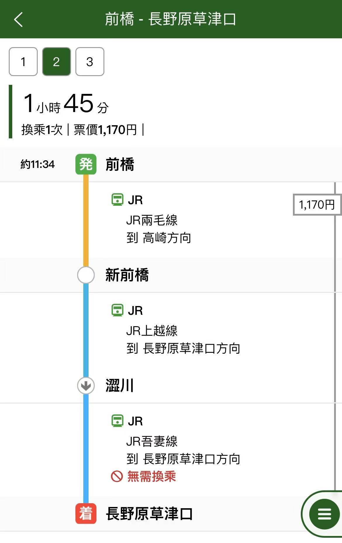 - 前桥多米酒店>步行>前桥站>乘坐两毛线电车>新前桥站>站内换乘电车>长野原草津口站—¥1170.00/人(含税)