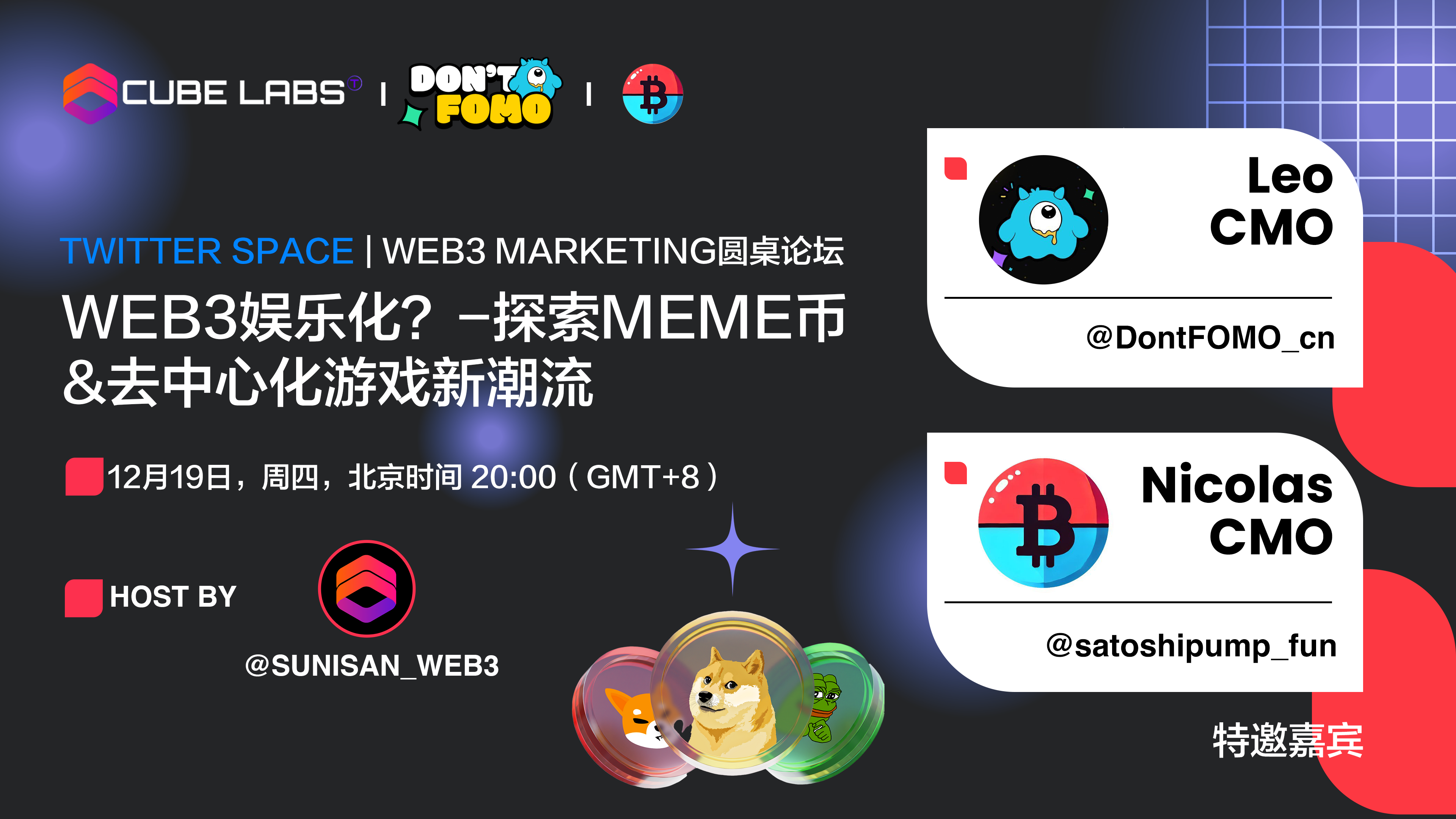 Cube Labs在12月19日举办的AMA主题为探索Web3娱乐化浪潮,我们邀请了Meme币项目SatoshiPump和去中心化游戏Don't FOMO两大创新项目方,从项目实践出发,深度探讨了娱乐化如何赋能社区,以及对未来市场趋势的独到解读。🧠