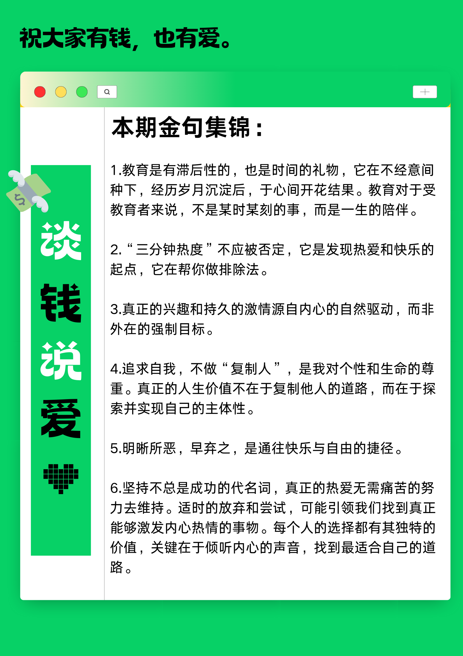 在接下来的节目中,我们还将持续和大家讨论年轻人关心的话题——如何搞钱,如何学会爱与被爱,我们想和你一起探索更幸福、更高品质的人生。