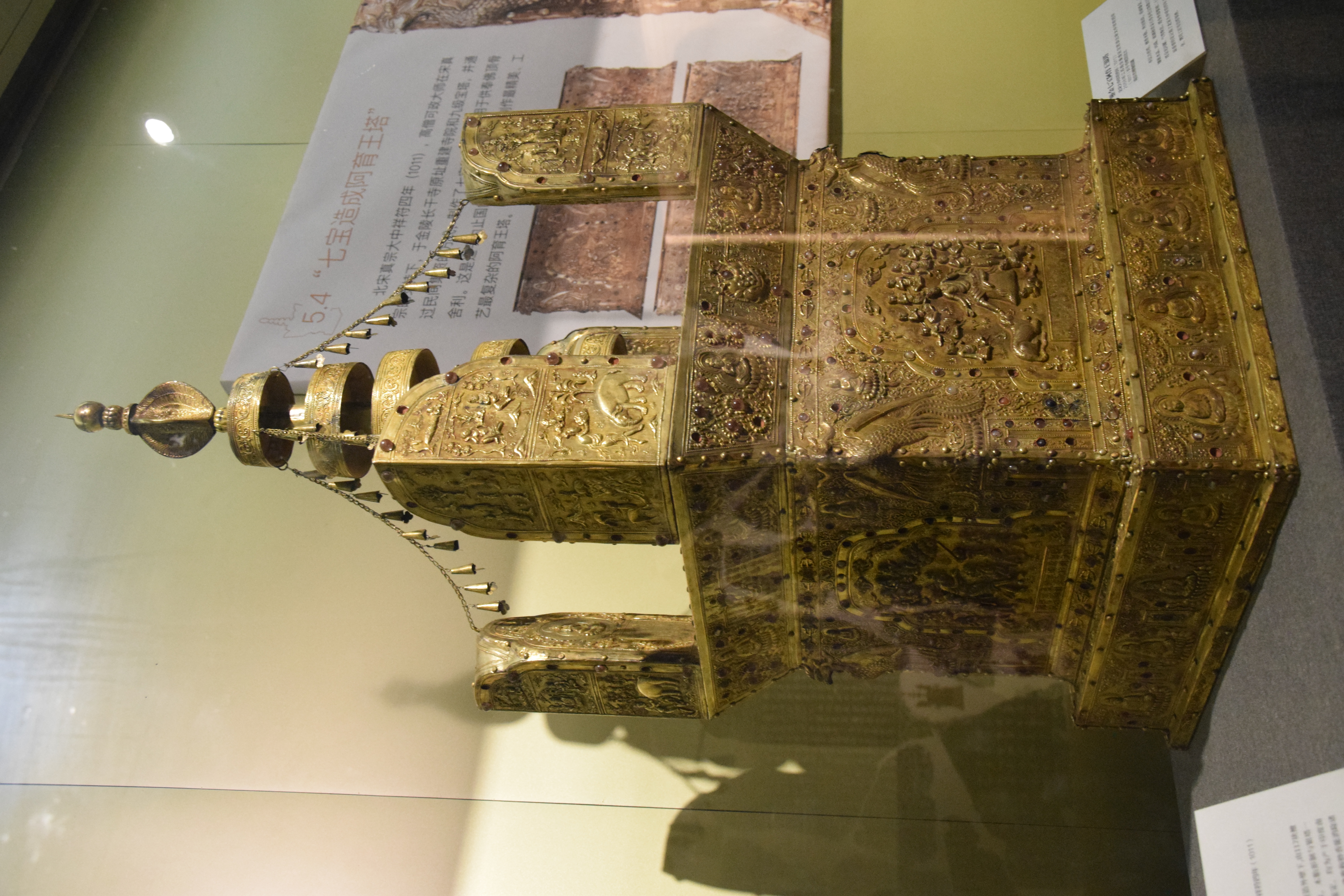 北宋大中祥符四年,鎏金七宝阿育王银塔,2008年江苏南京秦淮区宝塔顶北宋大中祥符四年(1011)长干寺地宫出土,南京市博物馆藏,介绍:单层方形塔,檀香木胎,外包银皮,表面鎏金。通体镶嵌水晶、玛瑙、玻璃和青金石等多色宝珠数百颗。整座塔金光闪耀、气势恢宏。塔身外部錾刻20条铭文,其中最重要的是记载了北宋大中祥符四年大师倡、施主捐舍、聘用工匠等造塔事迹(展出于2022年浙博“越颂”展)@场长