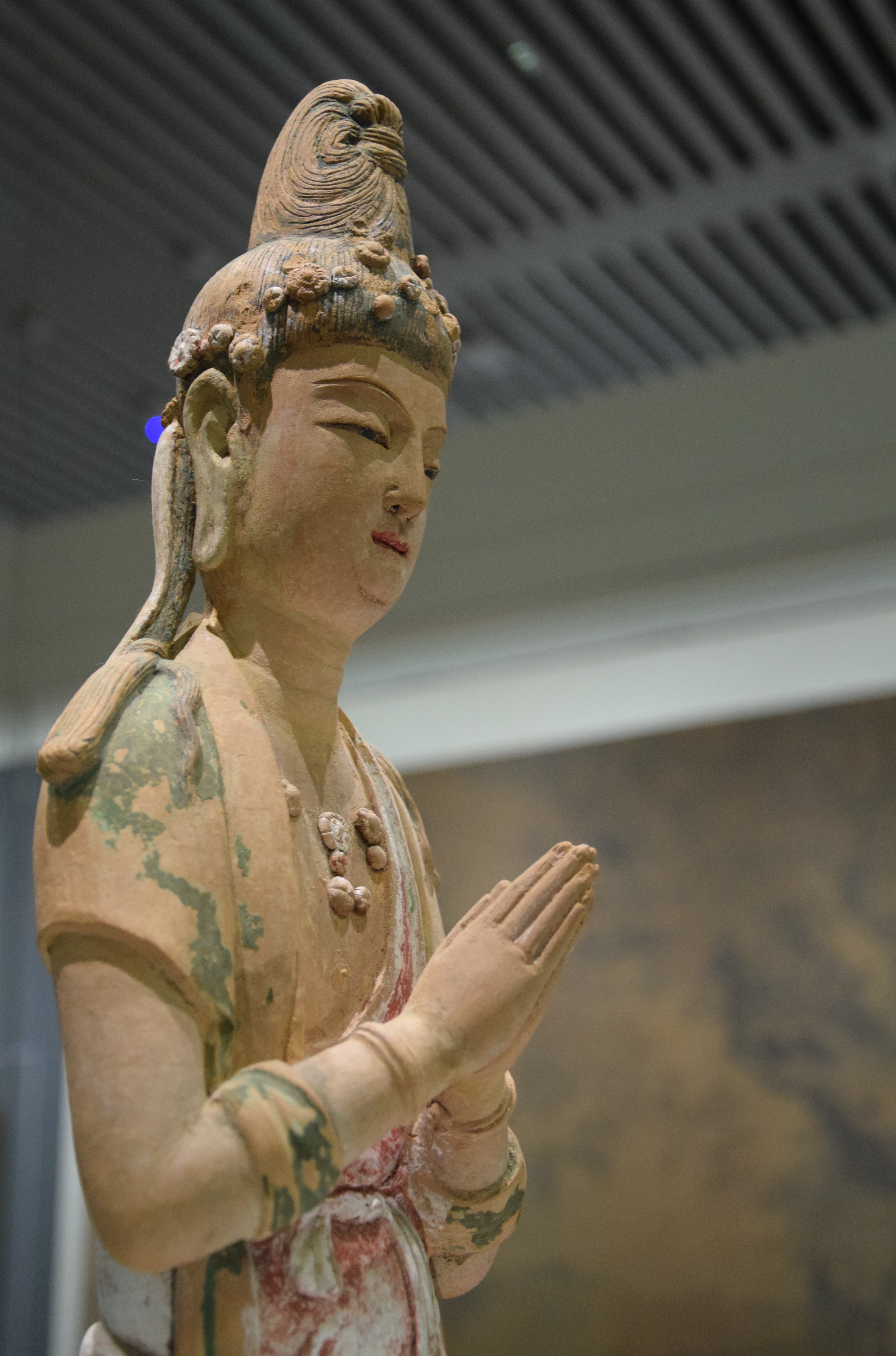 北宋,彩塑泥菩萨立像,1965年温州白象塔出土,浙江省博物馆藏,介绍:菩萨面容秀丽写实,体态修美轻盈,衣饰贴体简约,肌肤柔润匀称,散发出返朴归真的美感。其制作工艺体现了“瓯塑”的地方特色,是宋塑的典范之作-正面,上半身、头部 @场长