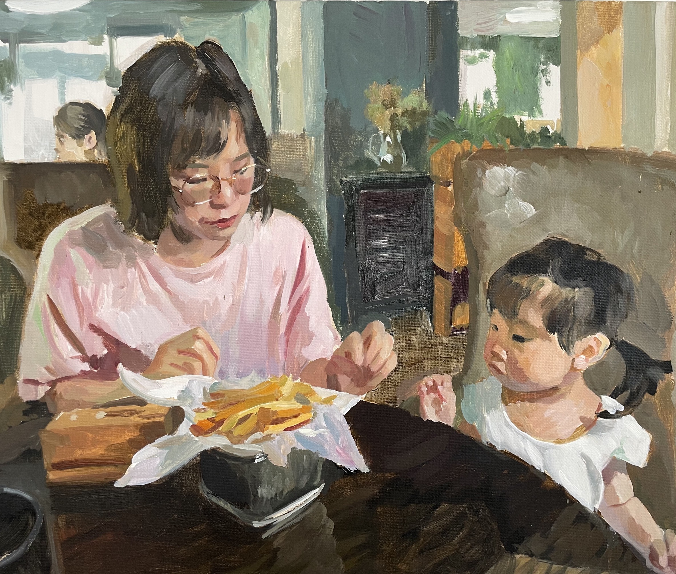 罗帅《吃薯条的母女》50x60cm 布面油画 2019年