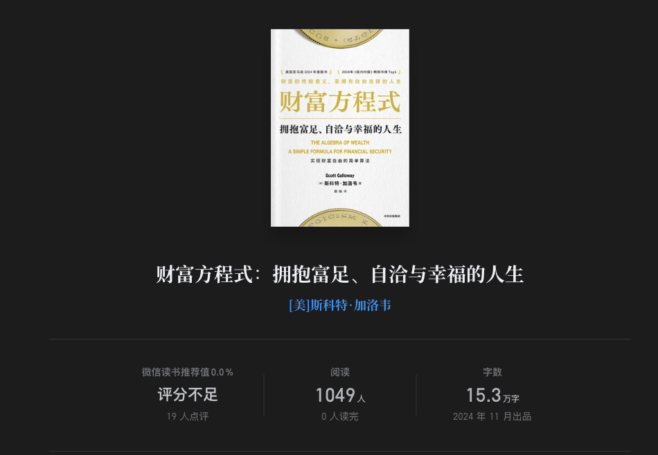 中信出版近期推出了新书《财富方程式:拥抱富足、自洽与幸福的人生》。作者斯科特・加洛韦以犀利幽默之笔,深入阐述人生各方面智慧。这本书不仅为读者提供了切实可行的财富增长策略,更深刻地揭示了在追求财富与留住财富的过程中,品格塑造、职业的选择、个人的修行所起到的至关重要的作用。