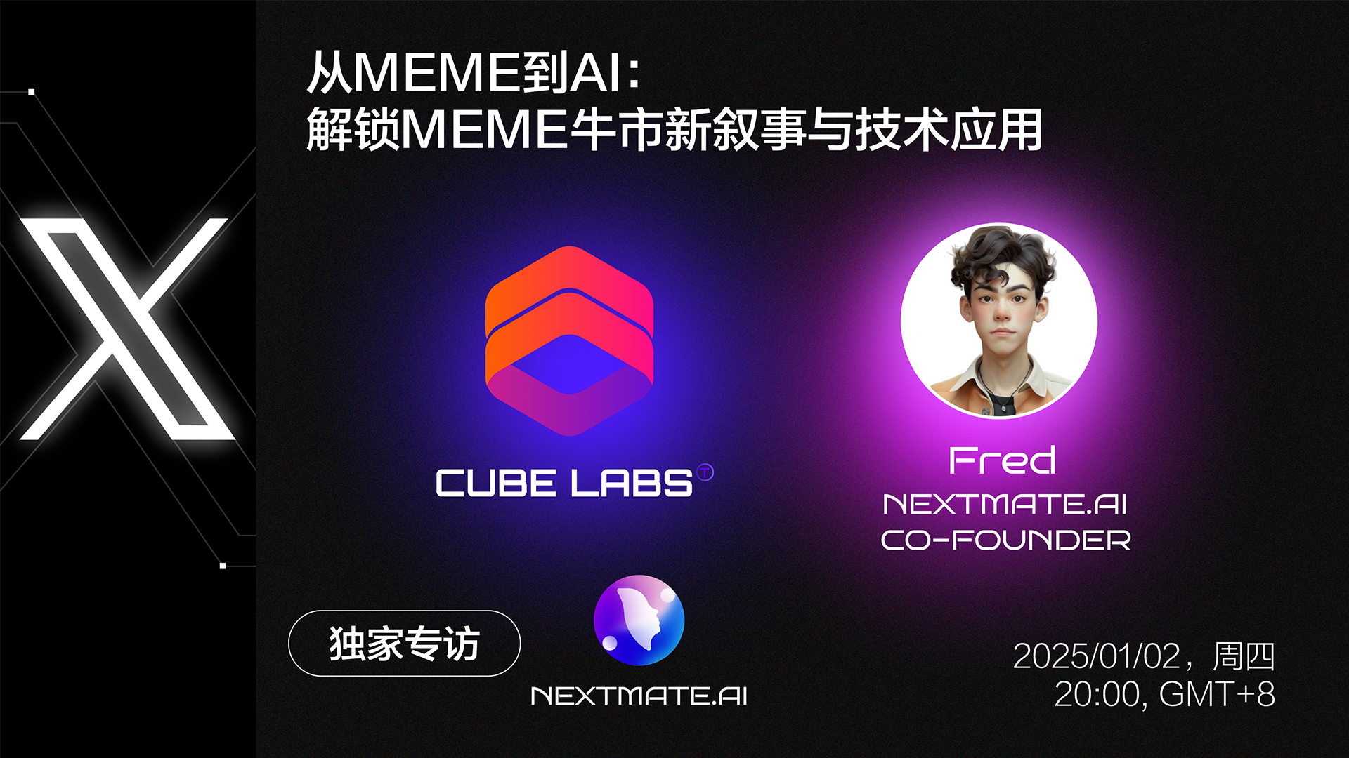 MEME正在重新定义Web3的可能性,而AI技术和去中心化的创新模式正在为加密玩家们带来全新的玩法和价值。Cube Labs于1月2日举办的主题为“专访Nextmate AI:AI如何赋能Meme生态”的AMA,邀请了Nextmate AI创始人Fred分享AI在Meme叙事,项目赋能,和情景用例等方面的创新实践。