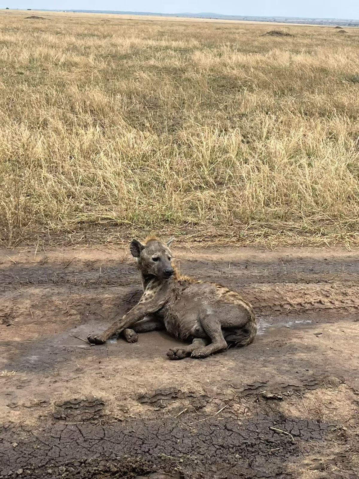 怀孕的鬣狗妈妈在泥水里休息 捡到食物的鬣狗