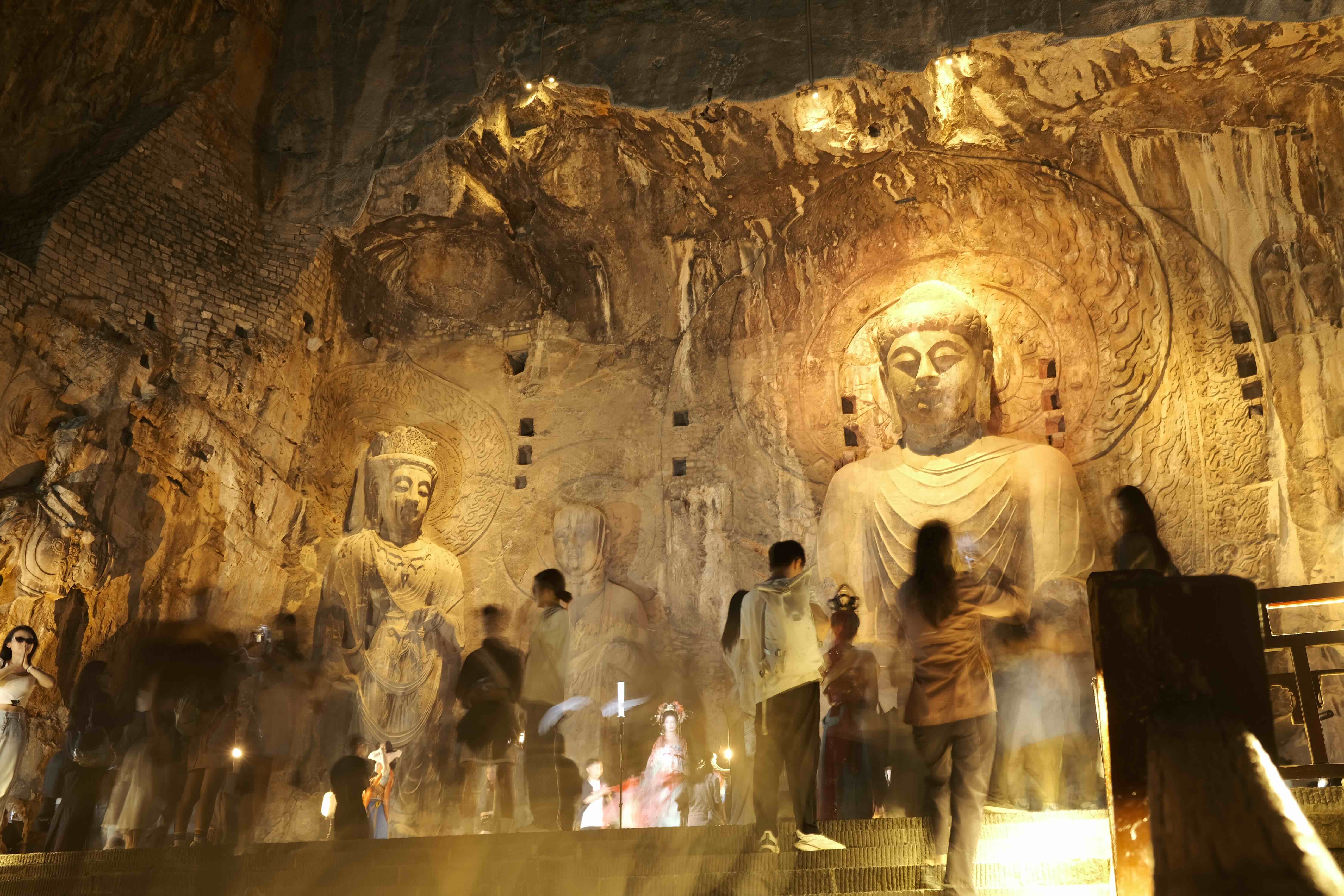 21:29 龙门石窟:位于河南洛阳,是中国现存规模最大、保存最完好的大型皇家石窟寺遗存。它开凿于北魏,历经多朝代,现存窟龛 2345 个,造像 10 万余尊。其代表作为奉先寺卢舍那大佛,展现了古代超高雕刻艺术水准 。龙门石窟于 2000 年被列入《世界遗产名录》,是国家 5A 级景区。下图是盖姐手机拍摄的龙门石窟: