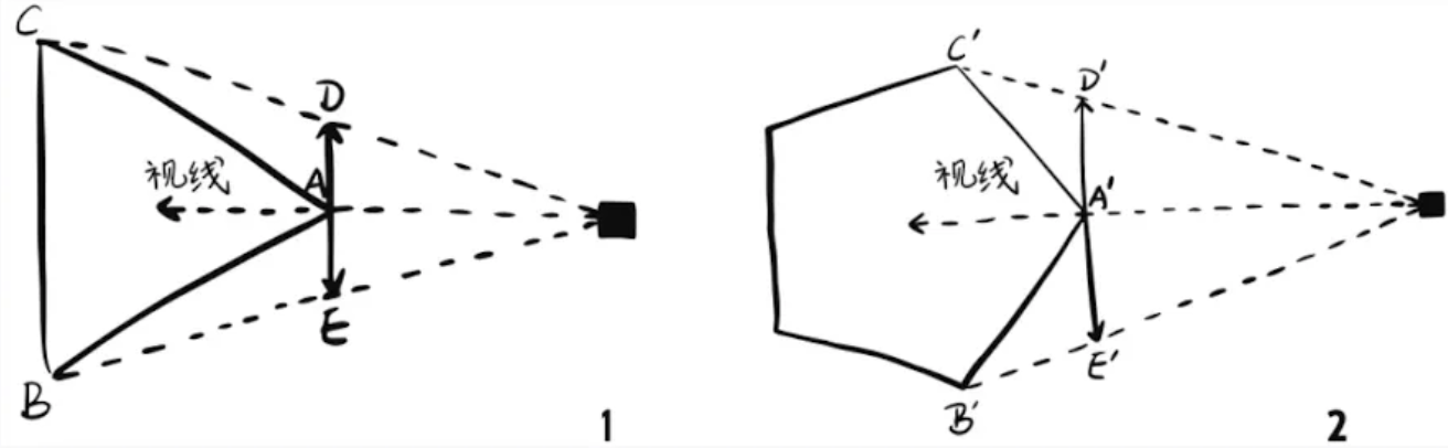 而在例子2,也就是医生的例子中,我会看到另一种情形。此时,虽然我仍然能够看到一条中点(A')明亮的线段(D'A'E'),但A'C'和A'B'两边变暗的速度较慢,因为这两条边隐入雾中的速度较慢。医生的另外两个顶点——点D'和点E'——虽然也比点A'暗,但没有商人的另外两个顶点——点D和点E——那么暗。”