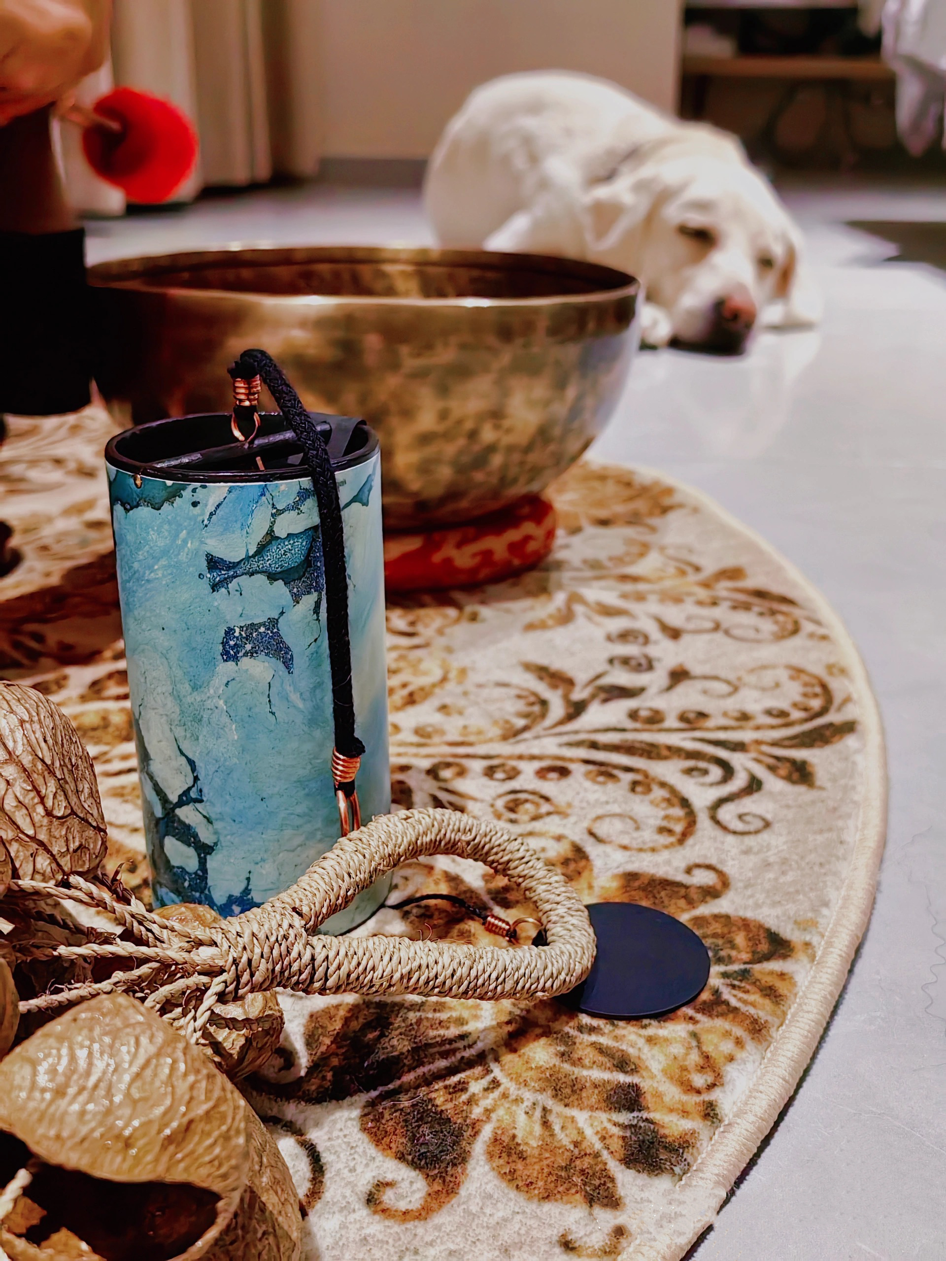 * 为了给生病的宠物小太辅助治疗,Hannah购买了多种乐器,如颂钵、果壳、风铃、海浪鼓、小钟等,之前坚持每天睡前演奏几分钟。本期片头的疗愈声音就是她本人演奏哒!