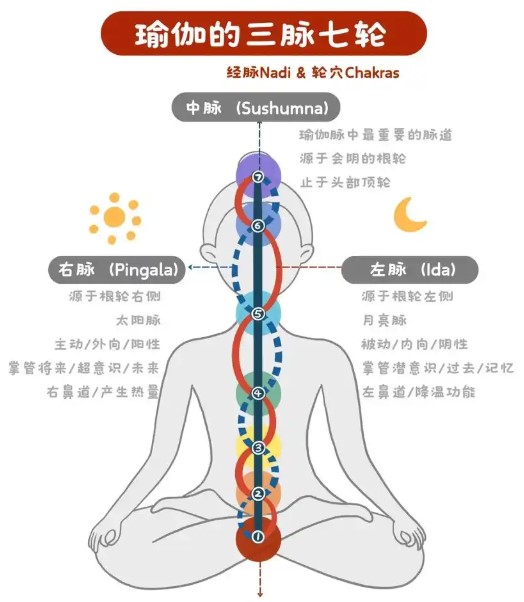 * 印度瑜伽体系中,人体有七万两千个nadis(脉),是肉眼不可见的能量系统,其中左脉和右脉是最主要的两条,分布在脊椎两侧,与呼吸调节相关,通过保持后背挺直等动作可使脉通畅,且左脉为阴性,右脉为阳性。