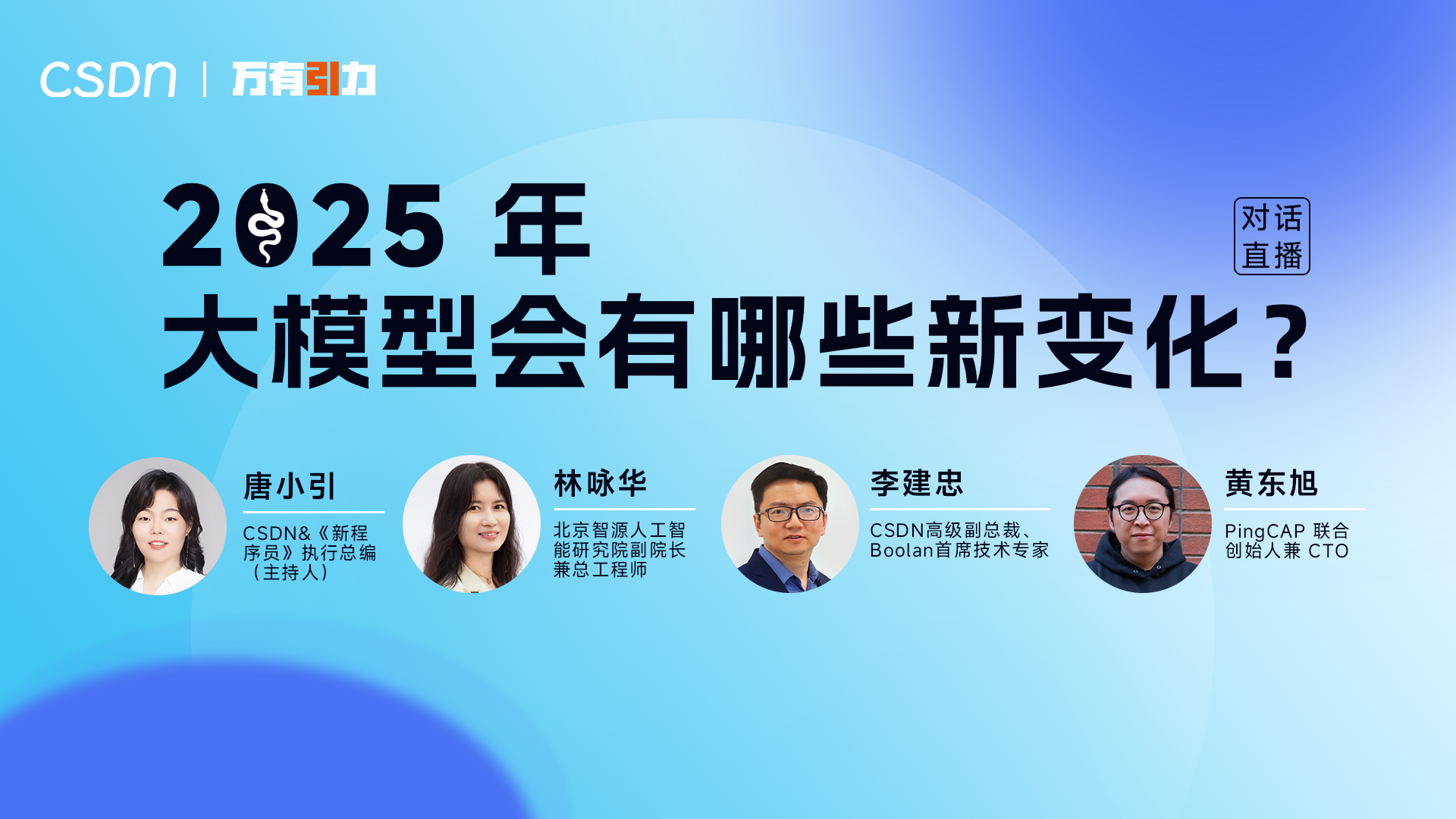 值此年关交替之际,CSDN、《新程序员》出品的对话栏目《万有引力》特别组织了《2025 年,大模型会有哪些新变化?》专题对话,邀请到: