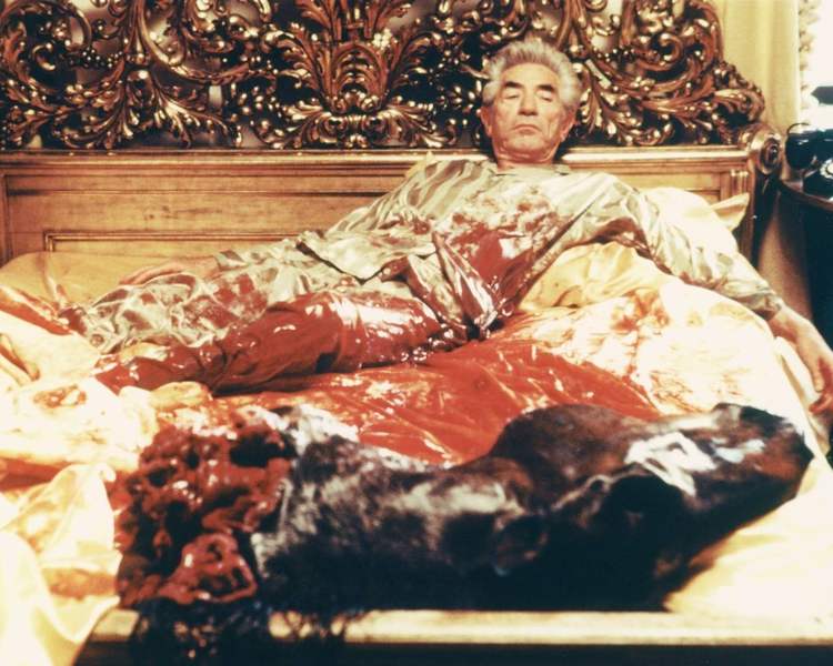 马里奥·普佐在《教父》小说这样描述制片人杰克·沃尔茨(Jack Woltz)发现他心爱的赛马的头颅与他同床共枕的那个时刻:“从身体上被切断,喀土穆大马那颗黑丝般的头颅被厚厚的血饼牢牢地粘在一起。”