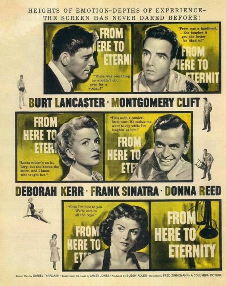 《教父》中这个令人难忘的情节毫无疑问来自好莱坞一桩著名的真实事件,而这个歌手就是美国著名的弗兰克·辛纳屈(Frank Sinatra),他要演的这部电影,就是哥伦比亚公司1953年拍摄的《乱世忠魂》(From Here To Eternity, 1953)。无论是在普佐的小说中,还是在科波拉的电影里,我们都能看到,约翰尼这个角色与辛纳屈之间有非常明显的相同之处,比如他们都与一位女演员结婚,但婚姻生活都不幸福。